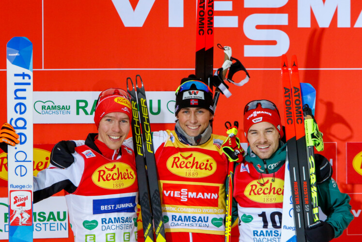Am Ende machten Rehrl und Riiber den Sieg unter sich aus, mit dem glücklicheren Ende für Riiber. Wobei Rehrl mindestens genauso strahlte: „Ich bin mir für meine Verhältnisse am Schluss gar nicht so schlecht vorgekommen, aber Jarl war dann natürlich doch etwas stärker. Ich bin ein bisschen überwältigt, gerade hier zuhause ist das schon Wahnsinn. Das gibt mir Selbstvertrauen, denn ich sehe, dass ich schon ganz gut sein kann, wenn ich meine sieben Zwetschgen beisammen habe.“ Dahinter entwickelte sich auf der Zielgeraden ein Sprint um den dritten Platz. Beteiligt: ausgerechnet Riessle und Rydzek, die vergangenes Wochenende bekanntlich beim Sprint der Langläufer in Davos angetreten waren. „Ich habe mir von den Langläufern den einen oder anderen Tipp geholt, wie man am Ende richtig sprintet“, lachte Riessle. Auch diese Taktik war von Erfolg gekrönt, denn er setzte sich im dreifachen Foto-Finish ganz knapp vor den zeitgleichen Geiger und Rydzek durch. Mit dem dritten Sieg in Folge bleibt Riiber natürlich der Gesamtführende, gefolgt von Mario Seidl, der mit seinem neunten Platz Frenzel vom zweiten Rang verdrängte. Auch Rydzek konnte sich vor Frenzel schieben. Außerdem liegt Riiber in der Wertung des besten Springers vor Rehrl. Das rote Trikot des besten Läufers bleibt nach wie vor bei Magnus Krog (NOR).