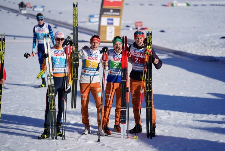 Beim anschließenden 4×5-Kilometer-Lauf schickte Österreich den WM-Debütanten Lamparter in die Startrunde, und der 19-Jährige legte los wie die Feuerwehr. Als er nach fünf Kilometern an Lukas Klapfer übergab, war Österreichs Vorsprung auf den nächsten Verfolger unverändert bei 24,7 Sekunden. Allerdings lag auf Rang zwei da bereits Norwegen. Deren Startläufer Espen Bjoernstad hatte mit der schnellsten Laufzeit des Rennens (10:23.8 min) schon zehn Sekunden gutgemacht. Knapp hinter ihm lag Akito Watabe, den Japan etwas überraschend als ersten Läufer eingesetzt hatte. Für Deutschland ging Terence Weber als Erster an den Start. Doch der Geyerer, der zum ersten Mal überhaupt in einer Staffel eingesetzt wurde, musste etwas Federn lassen. „Ich habe versucht, es etwas ruhiger anzugehen, um am Ende noch Körner übrig zu haben. Doch am Burgstall war das Tempo etwas zu hoch für mich“, bilanzierte der Sachse.