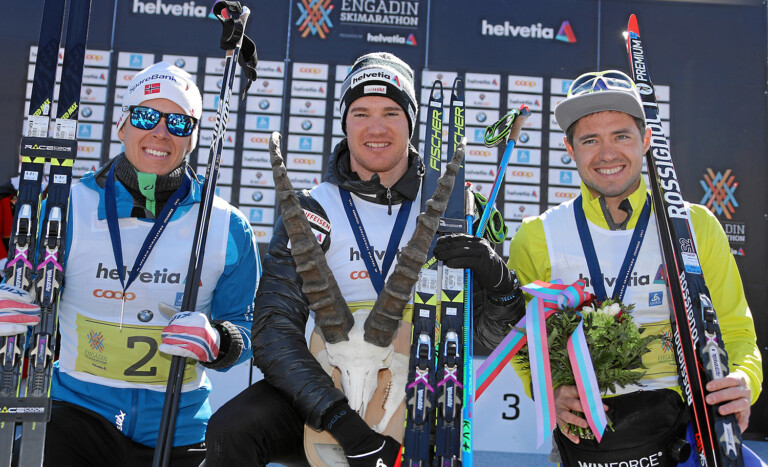 Bildergalerie Engadin Skimarathon Samedan 2017 Dario Cologna (1., M, Schweiz) , Anders Gloeersen (2., l, Norwegen) und Ilia Chernousov (3., r, Russland) heißen die Sieger des 49. Engadin Skimarathon © swiss-image.ch 1 2 3 4 5 6 7 8 9 10 11 12 13 14 © Bilder 1 - 14: swiss-image.ch;