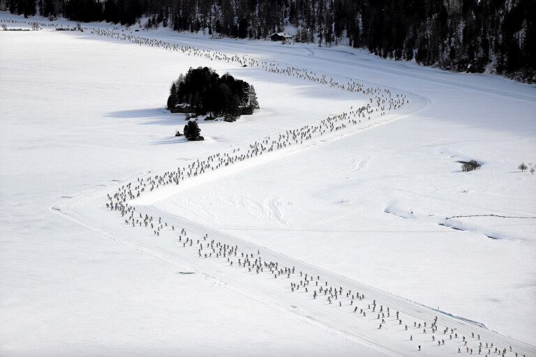 Flugaufnahme von der 'Marathon-Schlange' auf dem gefrorenen Silsersee kurz nach dem Start zum 49. Engadin Skimarathon © swiss-image.ch