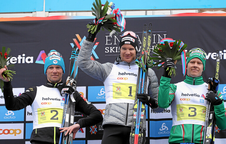 Dario Cologna (1., M, SUI) , Jean-Marc Gaillard (2., L, FRA) und Anders Gloeersen (3., R, NOR) © swiss-image.ch