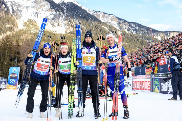 Julia Simon (FRA), Lou Jeanmonnot (FRA), Eric Perrot (FRA), Emilien Jacquelin (FRA), (l-r) © Manzoni/NordicFocus