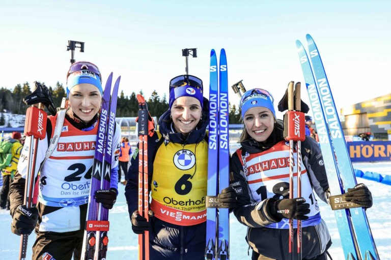 Tuuli Tomingas (EST), Julia Simon (FRA), Samuela Comola (ITA), (l-r) © Manzoni/NordicFocus