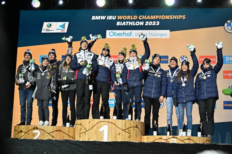 Didier Bionaz (ITA), Dorothea Wierer (ITA), Tommaso Giacomel (ITA), Lisa Vittozzi (ITA), Johannes Thingnes Boe (NOR), Sturla Holm Laegreid (NOR), Marte Olsbu Roeiseland (NOR), Ingrid Landmark Tandrevold (NOR), Emilien Jacquelin (FRA), Quentin Fillon Maillet (FRA), Anais Chevalier-Bouchet (FRA), Julia Simon (FRA), (l-r) © Reichert/NordicFocus