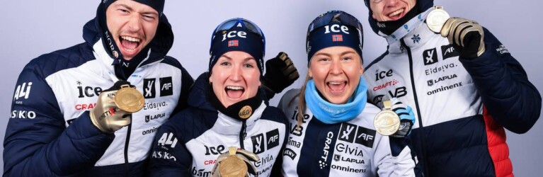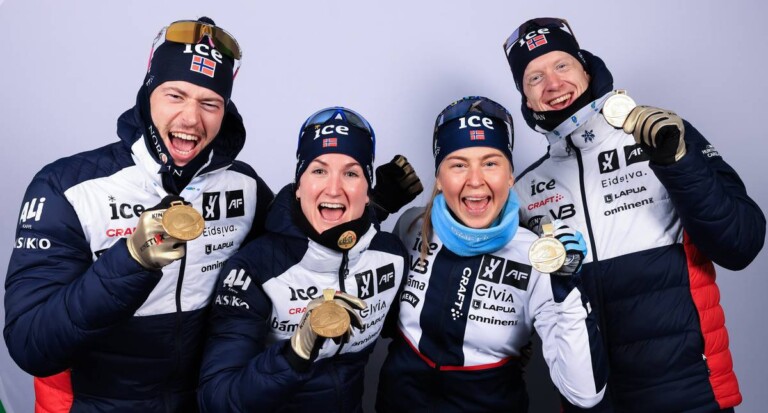 Sturla Holm Laegreid (NOR), Marte Olsbu Roeiseland (NOR), Ingrid Landmark Tandrevold (NOR), Johannes Thingnes Boe (NOR), (l-r) © Manzoni/NordicFocus