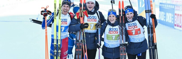 Quentin Fillon Maillet (FRA), Emilien Jacquelin (FRA), Anais Chevalier-Bouchet (FRA), Julia Simon (FRA), (l-r) © Reichert/NordicFocus