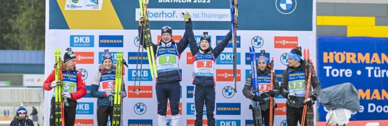 David Komatz (AUT), Lisa Theresa Hauser (AUT), Johannes Thingnes Boe (NOR), Marte Olsbu Roeiseland (NOR), Lisa Vittozzi (ITA), Tommaso Giacomel (ITA), (l-r) © Reichert/NordicFocus