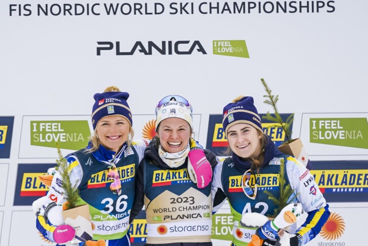 Die Schwedinnen Ebba Andersson und Frida Karlsson sowie Jessie Diggins galten als größte Medaillenfavoriten vor dem heutigen Rennen, in dem man einen klaren Kopf behalten musste, um sich nicht zu verlaufen. Zu laufen war zunächst eine 4,5 Kilometer lange „rote“ Runde inklusive der schweren Abfahrt zum tiefsten Punkt sowie die etwa 5,3 Kilometer lange „blaue“ Runde – allerdings sind manche Streckenteile identisch, so dass die Athletinnen aufpassen mussten, dass sie auf der richtigen Runde unterwegs sind. Jessie Diggins präsentierte sich in absoluter Topform und setzte mit Ausnahme der ersten Zwischenzeit nach 900 Metern, wo Jonna Sundling noch schneller war, sämtliche Bestzeiten. Bei der Stadionpassage nach 4,5 Kilometern kamen die Schwedinnen mit 1,1 und 1,6 Sekunden Rückstand sehr nah an sie heran, im Ziel lag die Amerikanerin aber klar vorne. Als sie wie immer völlig erschöpft ins Ziel fiel, hatte die eine Minute früher gestartete Frida Karlsson sich gerade so weit erholt, um sich aufsetzen zu können und einen Blick auf das Ergebnis zu werfen: Jessie Diggins war 14 Sekunden schneller. Ebba Andersson lag bei der letzten Zwischenzeit zwei Kilometer vor dem Ziel hinter ihrer Teamkollegin, so dass für Diggins keine große Gefahr mehr bestand und Andersson erreichte dann auch kurz darauf mit 19 Sekunden Rückstand den Bronzeplatz. Als nur 50 Athletinnen im Ziel waren, noch bevor Hennig oder Kalvå die Linie überquerten, durfte Diggins das Trikot der „Weltmeisterin 2023“ anziehen, so dass sie schon dann sehr emotional wurde und auch beim Siegerinterview nach dem Gewinn ihres ersten Einzel-Titel immer wieder gegen die Tränen kämpfen musste. „Das ist so emotional, so unglaublich. Ich muss meinem Team danken. Sie kamen alle aus dem Truck an die Strecke und das war so besonders. Das war wohl eines der besten Rennen in meinem ganzen Leben. Ich wusste, dass ich mich gut fühle und in guter Form bin. Aber du musst auch gute Ski haben und gutes Wachs und ich hatte heute alles, was ich gebraucht habe. Sie haben so hart gearbeitet, um das möglich zu machen. Ich bin so glücklich“, meinte die 31-Jährige, bevor sie erneut kurz ihre Gefühle überwältigten: „Es war ein sehr hartes Rennen. Ich habe meine Beine am Ende gar nicht mehr gespürt, aber das ist normal für mich. Ich habe einfach versucht, so viel Gas wie möglich zu geben. Ich bin so froh über den Neuschnee, so konnte ich in den Kurven arbeiten. Das ist die perfekte Strecke für mich. Viele spaßige Abfahrten und ich habe versucht, mit Freude zu laufen und so schnell ich konnte.“