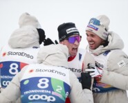 Ungefähr zur Rennmitte setzte neben dem Wind auch wieder Regen ein, was dem deutschen Team, das durch Albert Kuchler an achter Stelle gewechselt hatte, aber keine Sorgen machte: „Wenn es zu regnen anfängt, wird unser Ski noch schneller. Der kann die Nässe ab“, meinte Kuchler nach seinem Rennen, das er mit 1:08 Minuten Rückstand auf Norwegen und 35 Sekunden hinter der Gruppe in Sichtweite der USA beendet hatte. Für Schlickenrieder aber noch kein Beinbruch: „Die haben in der Verfolgergruppe extrem Gas gegeben, wenn die Tempo rausnehmen und Frie da wieder reinkommt, ist noch vieles möglich“, meinte er. Tatsächlich blieben die Abstände aber während Mochs Teilstück sehr konstant, die Arbeit in der Gruppe machte meist der gestrige Teamsprint-Vierte Davide Graz vor Jason Rüesch und Jules Lapierre, während Schwedens Jens Burman und Kanadas Max Hollmann zeitweise Probleme hatten. Schlussläufer Johannes Høsflot Klæbo konnte sein fünftes Gold von Trondheim über die gesamten 7,5 Kilometer genießen und sich von 29.000 Fans feiern lassen, nachdem Harald Østberg Amundsen ihm einen beruhigenden Vorsprung mitgegeben hatte. Um die weiteren Medaillen kämpften aber immerhin fünf Teams, darunter die Schweizer. In der Schlussrunde hielt Mathis Desloges das Tempo hoch, später kontrollierte Valerio Grond auf dem letzten Abschnitt an den Schanzen das Tempo, hinter dem sich Edvin Anger einsortierte.