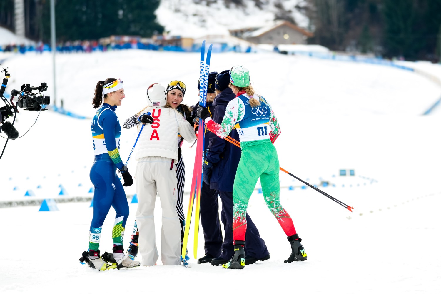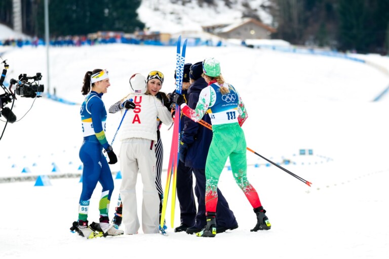 Olympischer Spirit: Bruna Moura (BRA), Regina Martinez Lorenzo (MEX), Jessie Diggins (USA), Ebba Andersson (SWE), Frida Karlsson (SWE), Samaneh Beyrami Baher (IRI), (l-r) © Vanzetta/NordicFocus