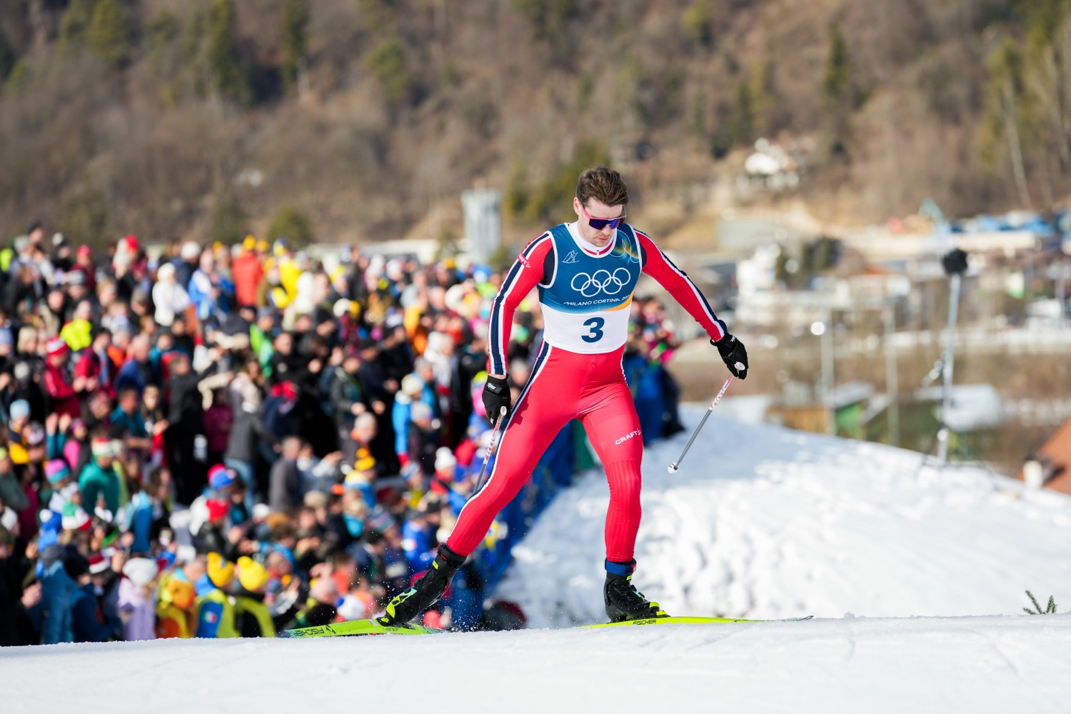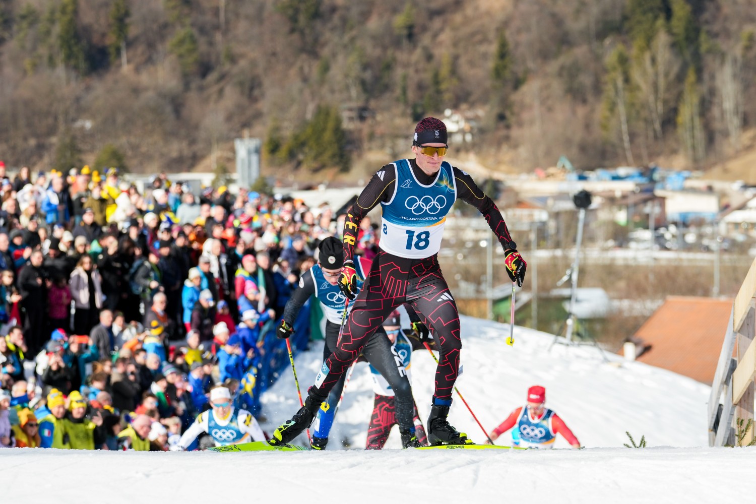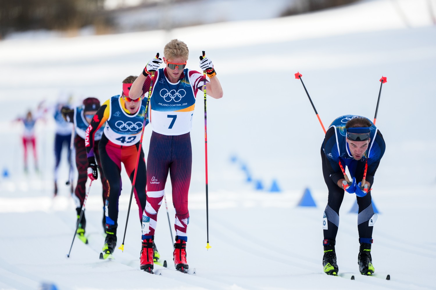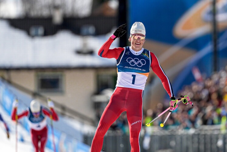 Auf der Schlussrunde zeigten sich Klæbo und Lapalus in den ersten Positionen, kurz darauf ging Nyenget in den Windschatten des Teamkollegen, der alles unter Kontrolle behielt. Durch seine Kurventechnik zog er schon in der Abfahrt die Gruppe auseinander, aber Desloges übernahm oben am vorletzten Anstieg, dem Macor-Anstieg, die Führung. In 1-1 Technik attackierte Klæbo in beeindruckender Frequenz am Zorzi-Anstieg, wo er wieder eine Klasse für sich war. Ohne jemandem Windschatten zu bieten ging er mit großem Vorsprung in die Valena-Abfahrt ins Stadion und er feierte seinen ersten Olympiasieg in einem Distanzrennen und den sechsten insgesamt. „Das ist eine große Erleichterung. Ich war sehr nervös in den letzten zwei Tagen. Das ist sehr gut, so in die Olympischen Spiele zu starten. Das ist unbeschreiblich, wirklich!“ Mathis Desloges hielt die Konkurrenten hinter sich und jubelte über die Silbermedaille vor Martin Løwstrøm Nyenget. Savelii Korostelev und Hugo Lapalus verpassten die Medaillen ganz knapp. Russland legte noch Protest wegen des Abkürzens ein, die Jury hörte sich beide Seiten an und diskutierte dann erneut den Vorfall. Letztendlich blieben sie aber bei ihrer Entscheidung, eine gelbe Karte zu geben und keine Disqualifikation. Auch in Norwegen gab es unterschiedliche Meinungen zur Bestrafung, am Ende entschied man sich aber, keinen Protest einzulegen. „Das war mein eigener Fehler. Ich habe einfach nicht nachgedacht, als ich die Kurve nahm. Das tut mir leid“, so Desloges bei NRK, der damit schon 50 Prozent seiner Ziele erreicht hat: Eine Einzel- und eine Teammedaille. Um einen möglichen Verlust seiner Medaille machte er sich keinen Gedanken: „Nein, ich denke, die Jury ist der Meinung, dass es einfach ein Fehler war und ich mir keinen Vorteil verschaffen wollte.“ Korostelev reagierte überrascht, als er nach dem Rennen erfuhr, dass es nur Gelb gab, sagte aber nur: „Das liegt ganz allein in der Verantwortlichkeit der Jury. Es ist nicht meine Aufgabe, darüber zu urteilen. Ich kenne nicht alle Regeln. Aber es war schon lustig, als ich das sah. Mir ist das beim Warmlaufen nämlich auch passiert.“ Sechster wurde Harald Østberg Amundsen mit 30 Sekunden Rückstand, der ohne den Sturz definitiv ein Medaillenkandidat gewesen wäre. Rang sieben ging an Truls Gisselman und Davide Graz wurde als bester Italiener Achter vor dem drittbesten Franzosen Jules Lapierre, Andrew Musgrave und Arsi Ruuskanen.