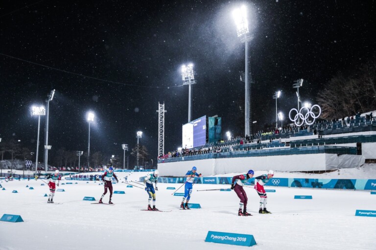 Johannes Hoesflot Klaebo (NOR) vor Alexander Bolshunov (RUS), Federico Pellegrino (ITA), Teodor Peterson (SWE), Alexander Panzhinskiy (RUS), Paal Golberg (NOR) im Halbfinale © Modica/NordicFocus