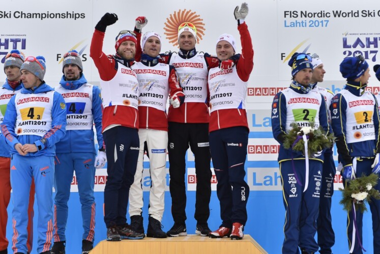 Didrik Tønseth, Niklas Dyrhaug, Martin Johnsrud Sundby und Finn Hågen Krogh heißen die Weltmeister über 4×10 Kilometer. Sie gewannen das Staffelrennen vor Russland. Bronze holten sich die Schweden nach hartem Kampf in der Gruppe.
