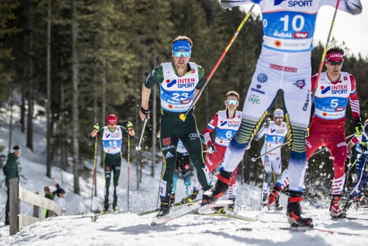 …über den Konter von Bolshunov:Jetzt probieren wir natürlich, die Medaillen ein bisschen sicher zu machen. Ob das so klappt, weiß ich noch nicht, aber Bolshunov wird nun ein bisschen rankommen. Wir haben alle 4 vorne dabei, also es sieht ganz gut aus für uns. Ich hoffe nicht, dass sich der ausgelassene Skiwechsel negativ auswirkt, aber es könnte sein. Zum Beispiel Belov, der hat schon 2x gewechselt, weil das zweite Paar war nicht so gut wie die ersten und jetzt hat er wieder ganz gute Ski. Es ist schwer zu sagen, wie es ausgeht.