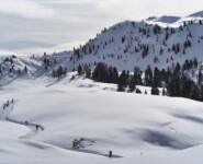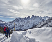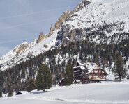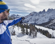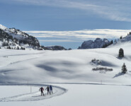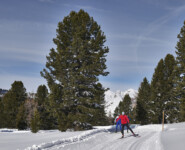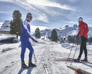 Endlich ist Zeit zum Reden. Zwar durften wir nicht die vor uns liegende Serpentinenstrecke vom Höhlensteintal aus in die Berge aufsteigen, die Lawinengefahr war noch zu groß. Trotzdem war die zuvor zurückgelegte Langlaufrunde vom Hotel „Hohe Gaisl“ bis hinauf zu unserem 2040 Meter hohen Aussichtspunkt nicht unbedingt dazu geeignet, längere Gespräche zu führen. Ob es nun an der dünnen Luft oder unserer Sprachlosigkeit ob der gigantischen Landschaft lag, sei dahingestellt. Oben ist oben und Florian Kostner erklärt uns in bester Bergführer-Manier die umliegenden Berge, während Stephanie Santer, ganz die Ehefrau, fleißig die Namen der Berggipfel korrigiert. Wichtig dabei: unter uns, ganz weit unter uns, etwas links versteckt, sieht man Schluderbach im Höhlensteintal, gelegen an einer der bekanntesten Langlauftouren schlechthin. Spätesten seit der Tour de Ski, allerspätestens aber seit unserer Reportage im letzten Jahr kennt jeder die Strecke zwischen Cortina d’Ampezzo und Toblach. Auch dort lassen sich gehörig Höhenmeter machen, doch ist die ehemalige Bahnstrecke kein Vergleich zu der Runde, die sich ab Schluderbach über die Plätzwiese, hinunter nach Prags und das Pustertal zurück nach Toblach absolvieren ließe. Auch wenn die Angaben leicht variieren, rund 40 Kilometer und 1.000 Höhenmeter im Anstieg sind eine Ansage.