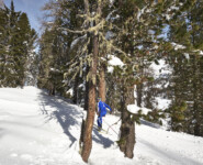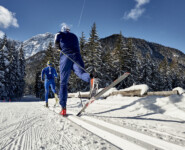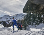 Nur ein paar Minuten entfernt liegt Toblachs sportlichstes Bauwerk, die Nordic Arena, bekannt aus zahlreichen Langlauf-Weltcups. Gerade jetzt, in der Zeit Anfang Februar, wenn der letzte Feinschliff für die Weltmeisterschaften ansteht, treffen sich noch einmal die Nationalmannschaften zum finalen Trainingslager. Deutschland, Russland und Finnland geben sich gerade die Ehre, als wir die schattig aber dadurch schneesicher gelegenen Wettkampfloipen erreichen. Wer sich noch etwas austoben will, ist auf den Loipen „Nathalie“, „Stephanie“ und „Saskia“ genau richtig. Florians Schwiegervater hat hier bei diesem maßgeblich von ihm mit initiierten Projekt die Namen seiner Kinder verewigt und damit den erfolgreichen, vor allem aber enthusiastischen Langläuferinnen ein Denkmal gesetzt. Ein Hauch von bitterer Ironie steckt schon darin, dass nun gerade Stephanie sich im elterlichen Betrieb ums Büro zu kümmern hat, während wir versuchen uns an Florians Skienden zu klemmen. Bleibt zu hoffen, dass ein Tag auf der Plätzwiese genug Entschädigung war für all die Arbeit, die hier für den nordischen Skisport geleistet wird.