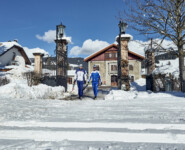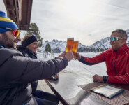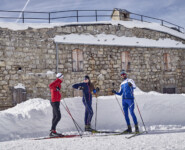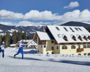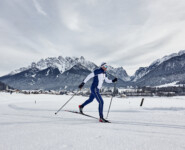 Wir sind zurück in Toblach, im Hotel Union, dessen Besitzer Enrico Comini zwar weniger Zeit auf den Wettkampfloipen verbracht hat, aber kaum weniger Begeisterung für den Langlaufsport besitzt. Als Mitglied bei den Cross Country Ski Holidays garantiert er besten Service für Langläufer und opfert für die Ortsloipe sogar einen Teil seiner Hotelparkplätze. So ist es egal, ob wir nun Richtung Niederdorf oder Innichen wollen, der Einstieg ist jeweils keine 15 Meter vom Hoteleingang entfernt. Hier holt uns Florian am nächsten Morgen zu einer kurzen Runde durch den Ort ab. Sightseeing auf Ski quasi, wobei auch jederzeit ein praktischer Nutzen mit den diversen Attraktionen verbunden ist. Da ist das Grand Hotel keine Ausnahme. Ein Prachtbau aus der Zeit, als hier noch vornehmlich österreichische Adlige zum Entspannen herkamen, der für uns vor allem den Loipen-Einstieg direkt neben dem Bahnhof markiert. Die öffentlichen Verkehrsmittel sind schließlich ein wesentlicher Bestandteil der sportlichen Infrastruktur, sei es nun mit dem Bus in die Täler hinein oder mit der stets kurz getakteten Bahn entlang des Pustertales.