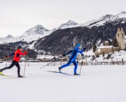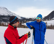 Es ist schon etwas Besonderes diesen Winter, wenn man in eine Region gelangt, die flächendeckend weiß erstrahlt und in der mehr als 100 Kilometer an Loipen gespurt sind. Deshalb freue ich mich wie ein kleines Kind, als ich über den Julierpass ins Engadin gelange. Nach meinem eher Skating-lastigen Besuch im letzten Jahr will ich dieses Mal die Klassik-Bedingungen und insbesondere die Strecke des La Diagonela testen. Dazu habe ich mich am ersten Tag mit Adriano Iseppi verabredet. Der Local im Engadin ist Wettkampfleiter des Skimarathons, der inzwischen zum zehnten Mal ausgetragen wird. Wir treffen uns auf einem kleinen Loipenparkplatz unweit von Celerina und in Sichtweite der San Gian Kirche, die in keiner Fotogalerie fehlen darf.