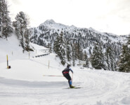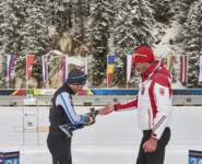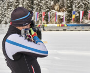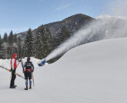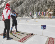 Der beginnt mit einer kurzen Autofahrt ins Antholzertal. An der Tourist-Info in Niederrasen erwartet uns Gerhard. Er ist Langlauflehrer in der Skischule Antholzertal und wird uns heute begleiten. Wenig später stehen wir am Startpunkt der Talloipe in Oberrasen und schnallen die Ski an. Die perfekt gespurte Loipe führt uns durch flaches Gelände bis nach Bad Salomonsbrunn. Dort sehen wir den Grund für die sehr guten Bedingungen trotz geringer Niederschläge: Hinter einem Schneeberg schießt eine Schneekanone Wasser in die Luft, das in Form von Schneekristallen wieder herunterfällt. Diesen Kunstschnee bringen die örtlichen Bauern, gegen Bezahlung natürlich, auf ihren Wiesen aus und ermöglichen so ein frühes Langlaufvergnügen, wie uns Gerhard erklärt. Da die Verbindung zum Biathlonstadion am Tal-Ende noch nicht hergestellt ist, steigen wir nochmal ins Auto und gelangen so zum wohl bekanntesten Bauwerk des Tales. Auch hier wird eifrig Schnee „geschossen“, damit noch vor Weihnachten alle Strecken fertig sind, auf denen dann Ende Januar die weltbesten Biathleten ihre Runden drehen. Da kommt uns das Angebot von Gerhard gerade recht. Mit Original-Biathlongewehren geben wir einige Schuss auf die Zielscheiben ab. In Ruhe geht das noch einigermaßen gut, unter Belastung wird es dann aber deutlich schwerer, die 11,5 Zentimeter großen Ziele zu treffen. Wir wollen sowieso lieber raus auf die Strecke. Hubersprung, Passlerschikane und vorbei an der Huberalm, in rasanter Geschwindigkeit geht es über die Streckenabschnitten, die eingefleischten Biathlonfans wohlbekannt sind.