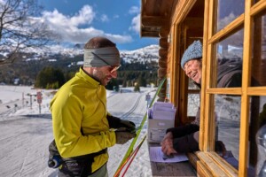 Am nächsten Morgen lasse ich es erstmal ruhig angehen. Schließlich habe ich mir für den ganzen Tag nichts anderes vorgenommen als Langlaufen. Ich steige erneut am Hotel in die Loipe ein, laufe aber nun in die andere Richtung und verlasse kurz darauf das Ufer des Sees. Am Kassenhäuschen für das Loipenticket empfängt mich eine nette und gut gelaunte Mitarbeiterin, die mir alle meine Fragen informativ beantwortet und am Ende sogar noch ein Probepäckchen Tee mitgibt. Bei so viel Service zahle ich gerne Loipengebühr.