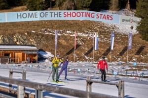 Früh am nächsten Tag begebe ich mich in die Roland Arena in Lantsch, wo ich mich wieder einmal im Biathlon versuchen will. Ich habe mich mit Franco verabredet, den ich schon von meinem Besuch von vor drei Jahren kenne (Biathlon Shooting-Star Lenzerheide: Auf Ski und mit Gewehr unterwegs in der Schweiz). Damals habe ich bei ihm ein Biathlon-Training absolviert, heute soll es etwas kompetitiver zur Sache gehen. Im Stadion wartet dann auch noch eine Überraschung auf mich. Elisa Gasparin, ehemalige Schweizer Weltcup-Starterin und EM-Bronzemedaillengewinnerin, schließt sich uns an und wird sich mit uns batteln. Nach ihrem Karriereende bietet sie in Lenzerheide Kurse zum Erlernen der Sportart Biathlon an. Heute soll es aber eher um den Spaß im direkten Duell gehen.