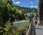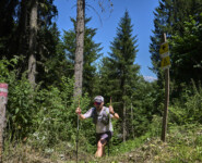 Ich erreiche Murau am Sonntagmittag und quartiere mich im Brauhaus Murau ein. Von meinem Zimmerfenster aus kann ich die großen Tanks sehen, in denen das Murauer Bier gelagert wird, das Sumann einst dank Kopfsponsoring weltbekannt gemacht hat. Ich bin aber nicht wegen dem Bier hier, sondern will unbedingt noch einen Gipfel erklimmen. Und so schnappe ich mir Trinkweste und Stöcke, um den Gipfel der Frauenalpe zu bezwingen. Los geht es direkt am Hotel, dann auf einer Brücke über die Mur und hinein in den Kreuzweg, der hinauf zur Wallfahrtskirche St. Leonhard führt. In Serpentinen schraubt sich der Pfad 50 Höhenmeter bergan. Hier könnte man perfekt ein Schrittsprungtraining absolvieren, doch mich zieht es weiter in Richtung Leonharditeich. Dort stehen auf der „Gesunde Runde“ Strecke mehrere Fitnessstationen parat. Und im Anschluss geht es dann in den langen Anstieg hinauf zur Frauenalpe.