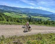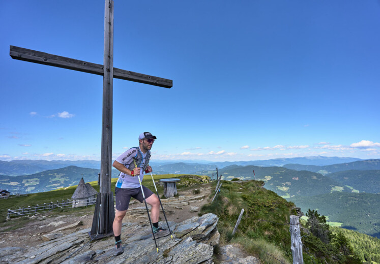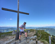 Über 1.100 Höhenmeter warten ab hier auf mich, weshalb ich es eher gemütlich angehen lasse. Nach wenigen Metern auf der Versorgungsstraße, die hinauf ins ehemalige Skigebiet führt, zweigt ein Singletrail ab, dem ich fortan folge. Immer wieder quere ich nach steileren Passagen die Asphaltstraße und mache so ziemlich schnell viele Höhenmeter. Der Trail ist technisch relativ einfach zu begehen und stellt mir keine größeren Hindernisse in den Weg. Nach etwas mehr als einer Stunde erreiche ich die Murauer Hütte und circa zwei Drittel der Steigung sind geschafft. Ab hier quert man die einstigen Skipisten des Gebiets Frauenalpe, die nach dem Abbau der Lifte jedoch nur noch von Skitourengehern genutzt werden. Über eine grasbewachsene Kuppe erreiche ich schließlich das Gipfelkreuz, von wo sich mir ein imposantes 360 Grad Panorama auf die umliegenden Berge bietet. Der Hunger treibt mich aber schnell wieder zum Aufbruch und ich lasse mir vor meiner Rückkehr ins Tal noch einen extrem leckeren Kaiserschmarrn an der Murauer Hütte schmecken.
