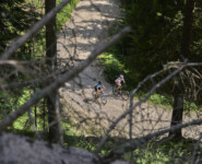 Nach einer geruhsamen Nacht treffe ich mich früh am nächsten Morgen vor unserem Hotel mit Wolfgang Maier. Der Sporthändler und ehemalige Continental Cup Skilangläufer betreibt im Winter die Kunstschneeloipe am Weirerteich. Im Sommer ist er Ansprechpartner für alles rund ums Bike. Und auf genau das schwingen wir uns jetzt für eine Runde durch die Region. Von Murau aus geht es zunächst parallel zur Mur und dann in den Anstieg hinauf nach Karchau. So früh am Tag lassen wir den Alpengasthof noch links liegen und fahren weiter bis zum höchsten Punkt am Tauernbründl. Schnell die Trinkflasche aufgefüllt und ab geht’s in die Abfahrt hinunter nach St. Lambrecht. Eigentlich könnte man jetzt die Runde schon schließen und zurück nach Murau pedalieren. Aber Wolfgang hat noch eine Zusatzschleife geplant, die uns rund um den Kalkberg führt. Nach wenigen Höhenmetern erreichen wir den Podolerteich, ein ruhig und wunderschön gelegenes Gewässer. Hier machen wir kurz Rast und kühlen unsere Waden.