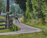 Hier verabschiede ich mich auch von Wolfgang, der mir aber noch einen Tipp zum Skirollern mit auf den Weg gibt. Und so stehe ich nach einer kurzen Erholungspause am späten Nachmittag am Ortsausgang von Murau Richtung Krakau. Hier verläuft ein Radweg parallel zur Straße, der sich dank welligem Gelände perfekt zum Skirollern eignet. Mal verläuft er nur durch Leitpfosten von der Fahrbahn getrennt, mal einige Meter abseits durch den Wald und schließlich Richtung Ziel in Ranten durch Wiesen und Felder. Lediglich an zwei Stellen gilt Vorsicht, so beim Überqueren einer Wasserrinne und später bei einer kurzen steilen Abfahrt mit anschließender Linkskurve. Der Rest der circa acht Kilometer bis zum Wendepunkt sind wunderschön zu laufen.