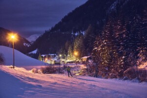 Ich mache mich dagegen auf den Rückweg und bin pünktlich zur mittäglichen Brotzeit wieder in Lienz. Nach einer kurzen Pause breche ich allerdings erneut auf. Dieses Mal zieht es mich in die entgegengesetzte Richtung. Mit der Buslinie 951 geht es ohne Umsteigen in knapp über einer Stunde nach Prägraten im Virgental. Ich steige am Gemeindeamt aus und schnalle meine Ski wenige Schritte später auf der Zubringerloipe wieder an. Diese führt mich zur Unterfeldrunde, einer wunderschönen Nachtloipe entlang der Isel. Dank Kunstschnee ist die Loipe auch schon früh in der Saison nutzbar. Zudem lädt ein Café am Loipeneinstieg zum Verweilen ein. Ich drehe mehrere Runden auf der 3,3 Kilometer langen Schleife, die tagsüber bis hinauf zur Panoramaloipe Ströden erweitert werden kann. Bei Dunkelheit entsteht aber eine ganz besondere Stimmung, die mich sofort gefangen nimmt.