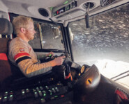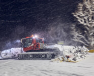 Markus steuert seine schwere Maschine zunächst durch das WM-Stadion. Einige male im Kreis, schon ist die Fläche eines Fußballfeldes fertig. Die schiere Größe des 400er Pistenbullys spart hier viel Arbeit und sorgt für die bekannt breiten Loipen rund um Ramsau. Viele andere Langlaufgebiete hätten nicht einmal Trassen, die breit genug sind. In dichtem Schneetreiben geht es hinaus auf die Loipen rund um den Kulm. Nun möchte man meinen, dass die Auflage reichen sollte, um einfach eine Spur zu legen. Doch weit gefehlt. „Wir legen jetzt die Grundlagen für eine lange Saison“, meint Markus, während er von umliegenden Wiesen Schnee auf die Trassen schiebt. 400 Pferdestärken ackern durch die weiße Pracht, die im dichten Schneegestöber wirklich von überall her zu kommen scheint. „Das ist nur bei richtig viel Schneefall möglich“, erklärt Markus mit Blick auf die touristisch wertvolle Winterlandschaft, die er gerade für wenige Augenblicke zerstört: „Morgen ist hier wieder alles tief verschneit.“ Und die Loipe gleichzeitig wieder etliche Zentimeter höher und damit leichter zu präparieren!