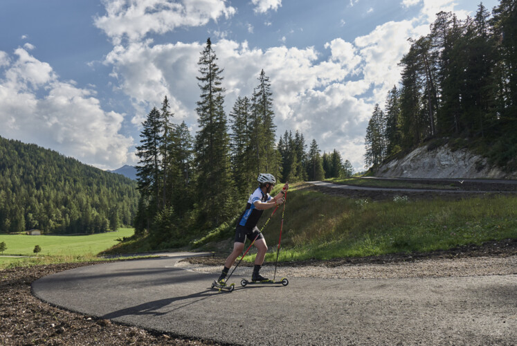 Nach den ersten Höhenmetern hinauf zur Brückenquerung geht es durch zwei Serpentinen der WM-Klassikstrecke. Auch im Sommer eignet sich dieser Abschnitt perfekt für einen langgezogenen Diagonalschritt oder kraftvolle 1-1er Schübe beim Skaten. Kurz darauf ist der höchste Punkt der Runde erreicht und es folgt nach einer 180 Grad Kurve eine durchaus fordernde Abfahrt. Schnelle kurze Richtungswechsel und eine langgezogene Kurve zum Abschluss verlangen gute Koordination und Schnelligkeit beim Umtreten. Dann ist man zurück oberhalb der Brücke und kann den „Rollercoaster-Abschnitt“ direkt noch einmal in Angriff nehmen. Wer das nicht will, biegt nach links ab auf die Brücke und gelangt über die längste, aber einfach zu meisternde Abfahrt zurück auf den Talboden. Am Rande des WM-Langlaufstadions führt die Rollerbahn dann über einen kleineren Hügel zum letzten Anstieg, der uns zurück ins Biathlonstadion bringt.