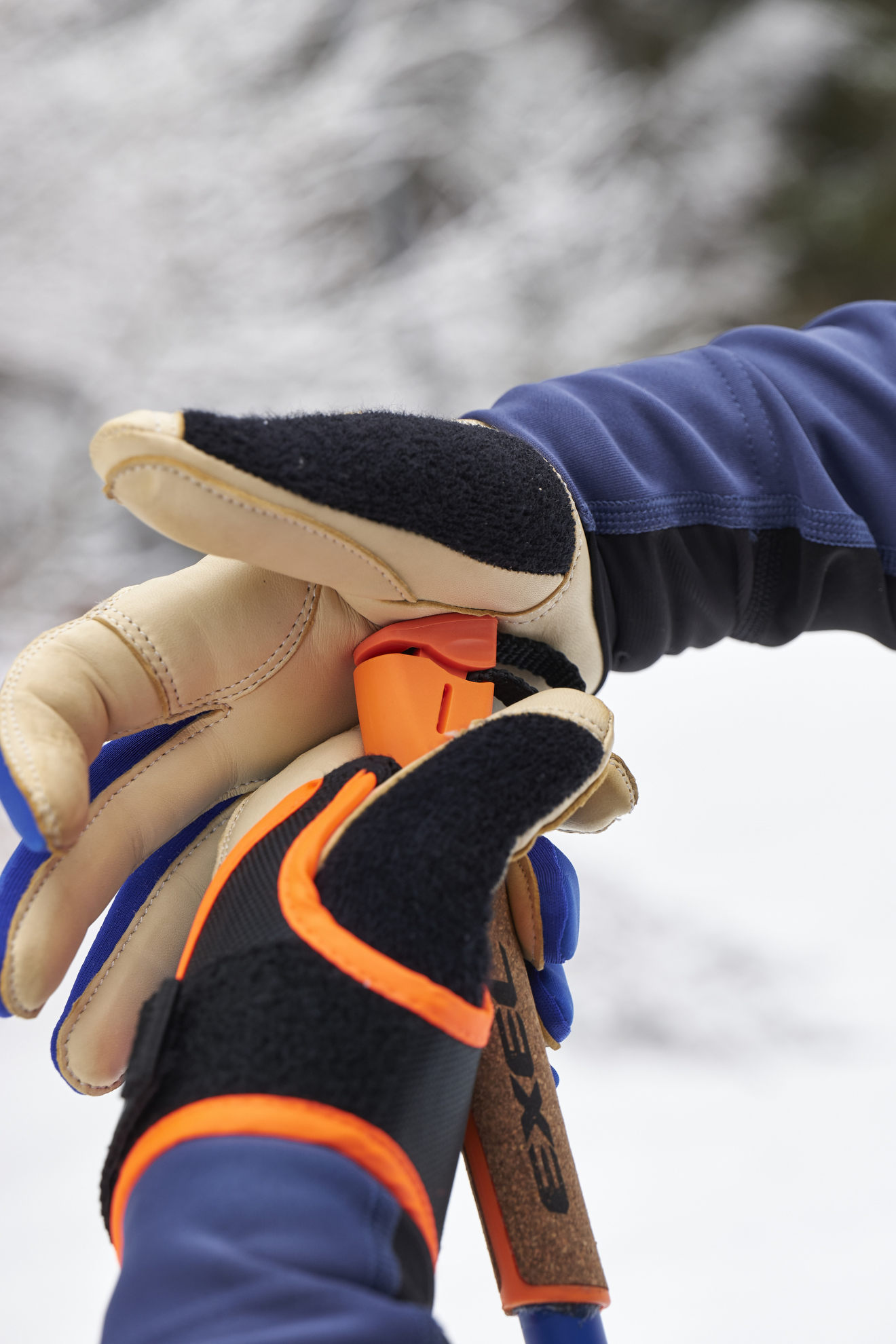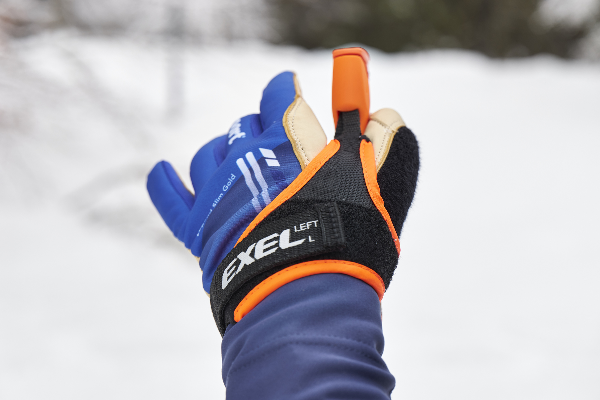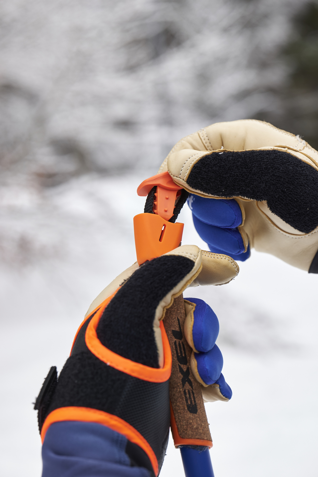 Ein eher steifes Modell haben die Finnen da an den Ultra 2 geschraubt. Zum Glück gilt das nicht nur für den Tragekomfort sondern vor allem auch in Zugrichtung. Durch die umgelenkte Klemmung sitzt die Schlaufe für ein Modell Klemmkeil auch extrem fest. Wenn sie denn mal da sitzt, wo sie hin gehört. Die Einstellbarkeit gehört nicht zu den Stärken der Exel-Schlaufe. Ziehen, überspannen, Klemmkeil drücken und dann hoffen dass trotz des recht engen Gummizuges zwischen den Schlaufenenden alles dort sitzt, wo man es haben will. Damit die Fusion-Schlaufe auf jede Hand passt gibt es vier Größen. Mit Handschuhgröße 9 passt L sehr gut.