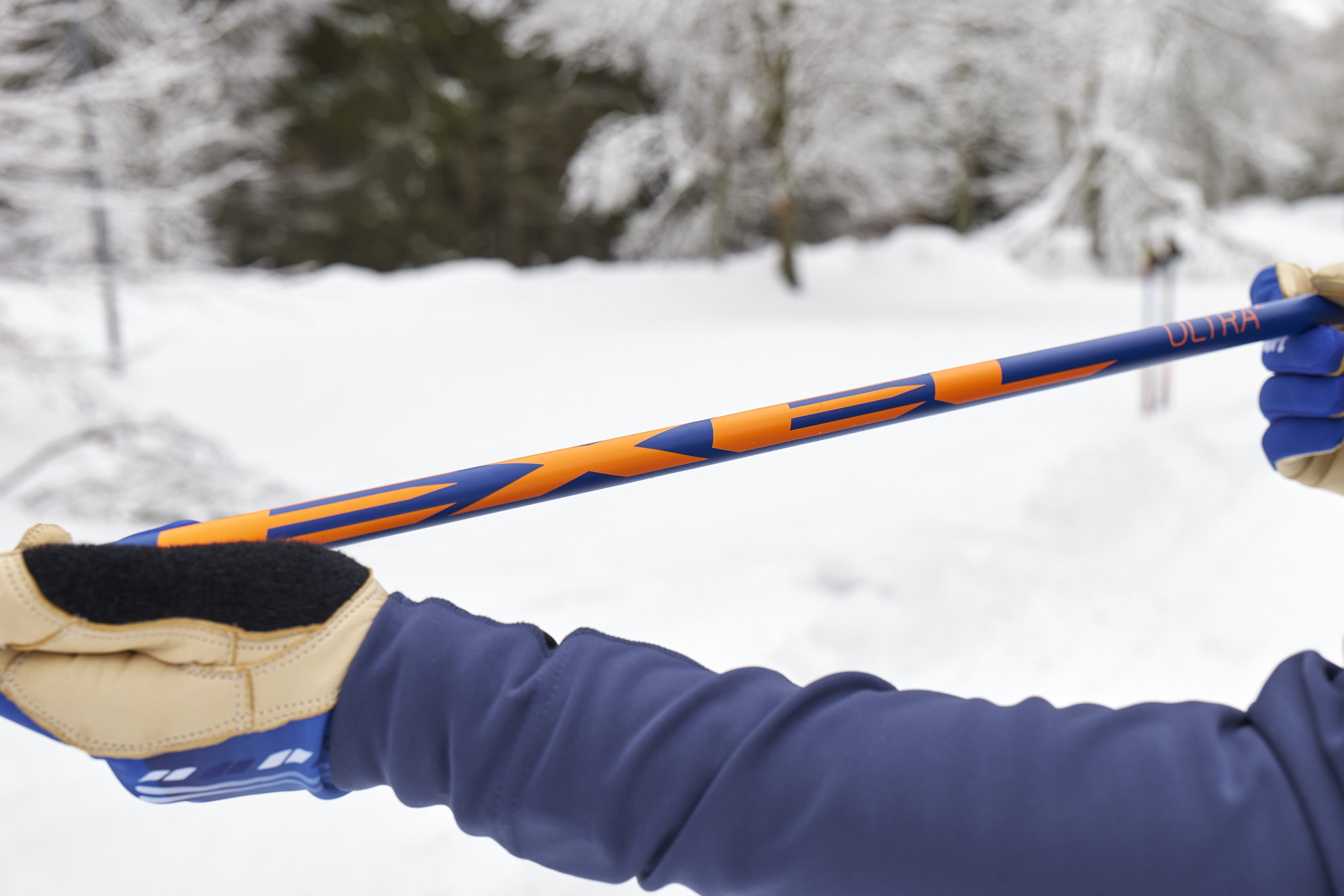 Hier steckt das wichtigste Know-How der reanimierten finnischen Traditionsfirma. Insgesamt ist der Exel Ultra 2 nämlich der schwerste Stock im High-End-Testfeld. Richtig gehört. In der Praxis fühlt es sich aber nach genau dem Gegenteil an, denn das Schwungverhalten ist erste Sahne. Ein Blick in die Tabelle zeigt das mit theoretischen Werten bestätigt: mit 61 zu 39 Prozent häuft sich das Gewicht im oberen Teil, sprich dem Griff, der Schlaufe und dem 16 Millimeter-Part des Rohres. Am Stockende ist dieses nur noch 7 Millimeter dick, was gepaart mit einer sehr leichten, geklebten Spitze nur sehr wenig Gesamtgewicht ergibt. Dabei ist die Konstruktion auch noch extrem steif, von Vibrationen ist nichts zu spüren.