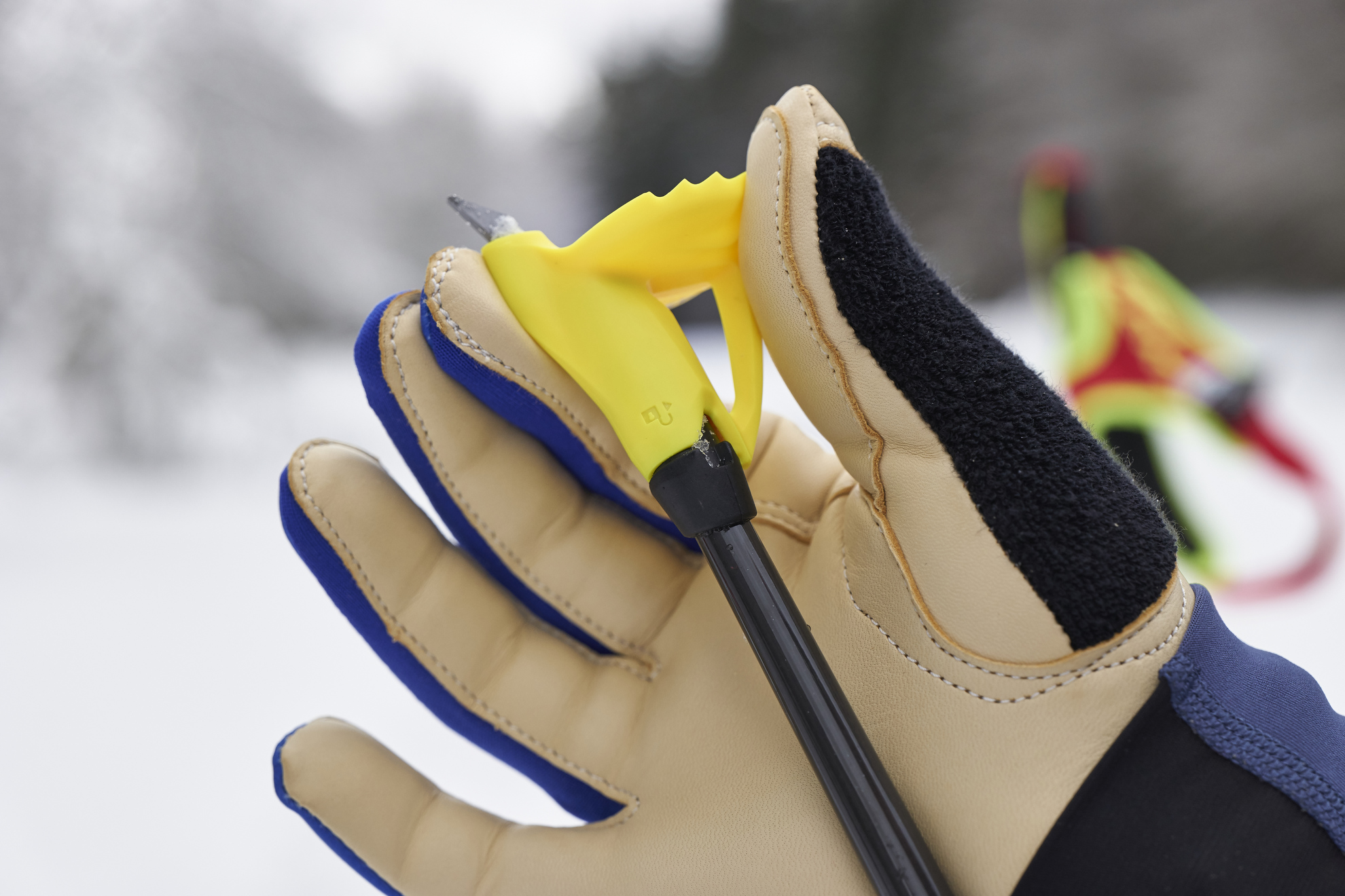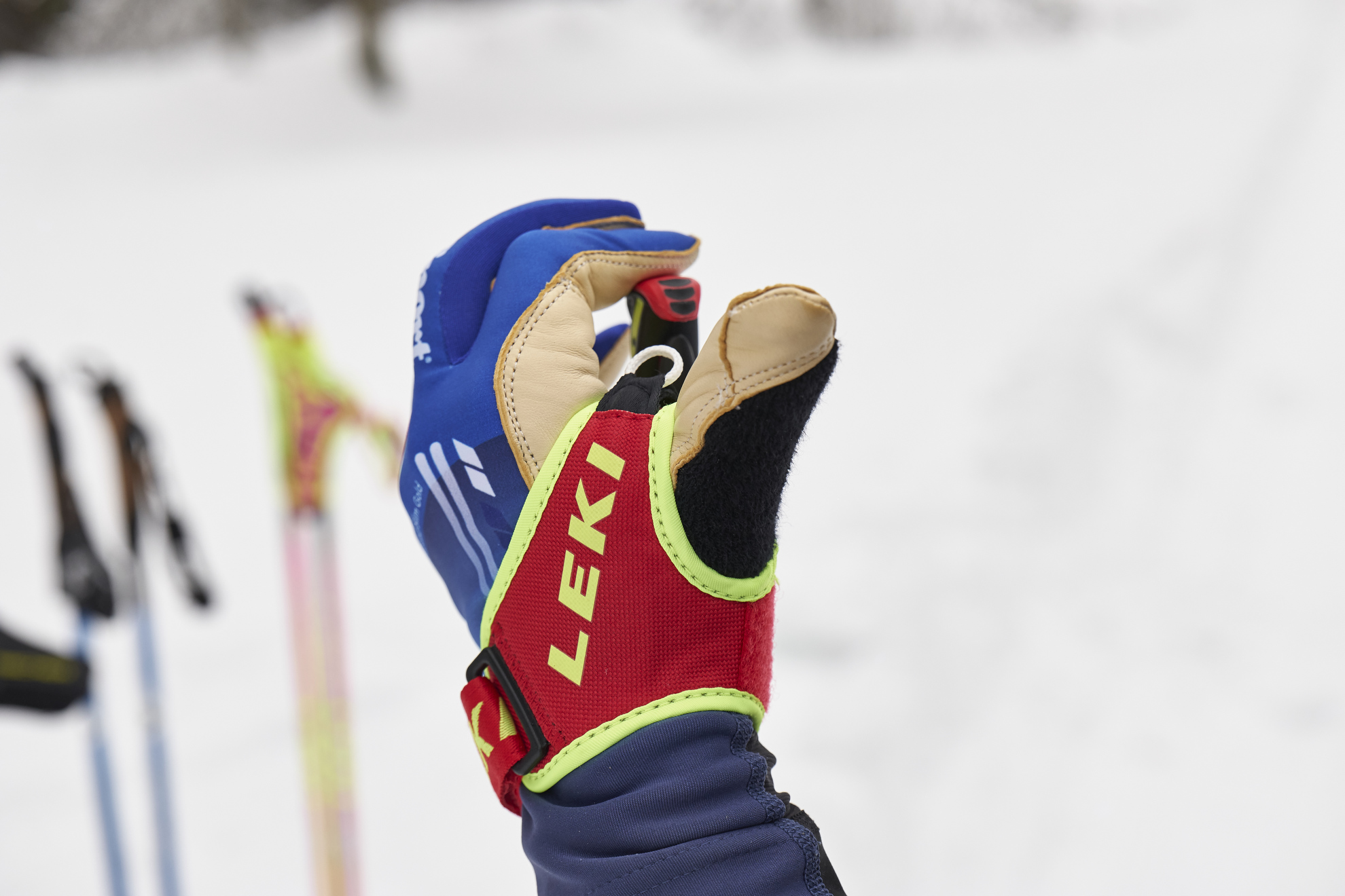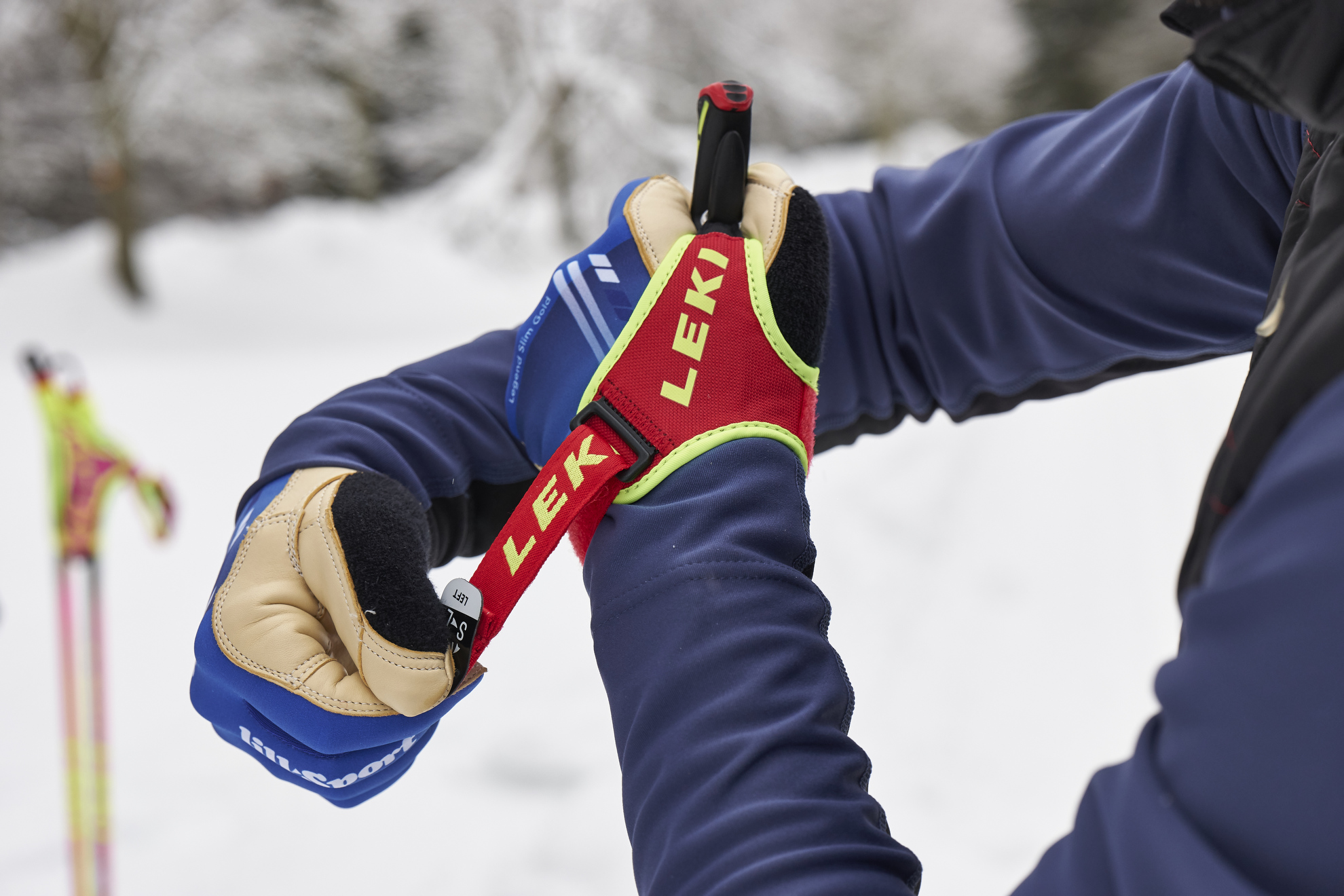 Hier hat der Shark definitiv die Größte Varianz im Testfeld zu bieten. Nebst drei verschiedenen Größen der Standard-Schlaufe (die getestete mittlere Variante S-M-L ist dabei etwas knapp bei Handschuhgröße 9) gibt es eine Weltcup-Variante in vier Größen und ein inzwischen sehr breites Angebot an Handschuhen mit eingearbeiteter Trigger-Schlaufe als Option. Der Vorteil dabei: es reicht ein Handschuh/eine Schlaufe für alle Leki-Stöcke im Skikeller. Selbst die Standard-Schlaufe sitzt schon sehr gut an der Hand, noch direkter sitzen erfahrungsgemäß die Leki-Handschuhe. Dabei bleibt zu beachten dass das Shark-System technisch bedingt dem Stock eine gewisse Rotationsfreiheit gewährt, die es in die Lauftechnik mit einzubeziehen gilt. Ein- und Ausklicken funktioniert seit der Einführung des Shark-2.0-Systems auch mit einer Hand problemlos. Apropos problemlos: beim Blick hinüber zum Max F fiel uns das extrem ausgeklügelte System der Keilklemmung auf, das in seiner technischen Reife dem Shark-System in nichts nachsteht. Der mehrteilige Keil wird Stück für Stück fixiert, was dann tatsächlich gewährleistet, dass die Schlaufe in der gewählten Position bleibt und nicht mehr nach rutscht. Besser hat auch das System kein anderer Hersteller gelöst