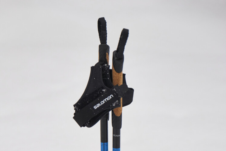 Einen sehr ovalen Griff hat Salomon da auf seinen Slab Carbon geschraubt. Besonders auffällig: zur Hand hin läuft der Querschnitt spitz zu, wodurch sich der Griff sehr dominant durch die Schlaufe drückt. Das kann man mögen oder nicht, jedenfalls ist die Bewegung des Stockes damit immer sehr präsent an der Hand. Kork ist an den wichtigsten Stellen vorhanden, dazwischen prangt Kunststoff in Carbon-Struktur-Optik.