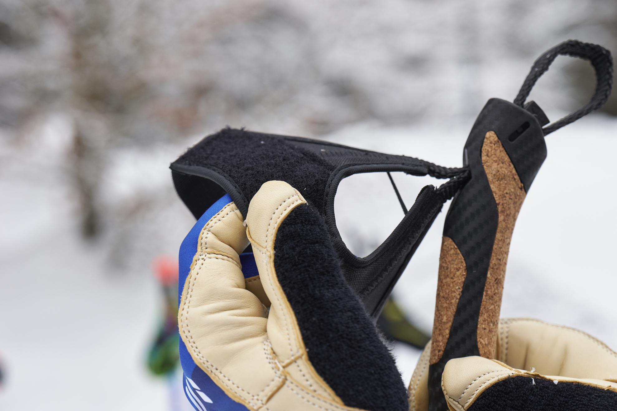 Einen sehr ovalen Griff hat Salomon da auf seinen Slab Carbon geschraubt. Besonders auffällig: zur Hand hin läuft der Querschnitt spitz zu, wodurch sich der Griff sehr dominant durch die Schlaufe drückt. Das kann man mögen oder nicht, jedenfalls ist die Bewegung des Stockes damit immer sehr präsent an der Hand. Kork ist an den wichtigsten Stellen vorhanden, dazwischen prangt Kunststoff in Carbon-Struktur-Optik.