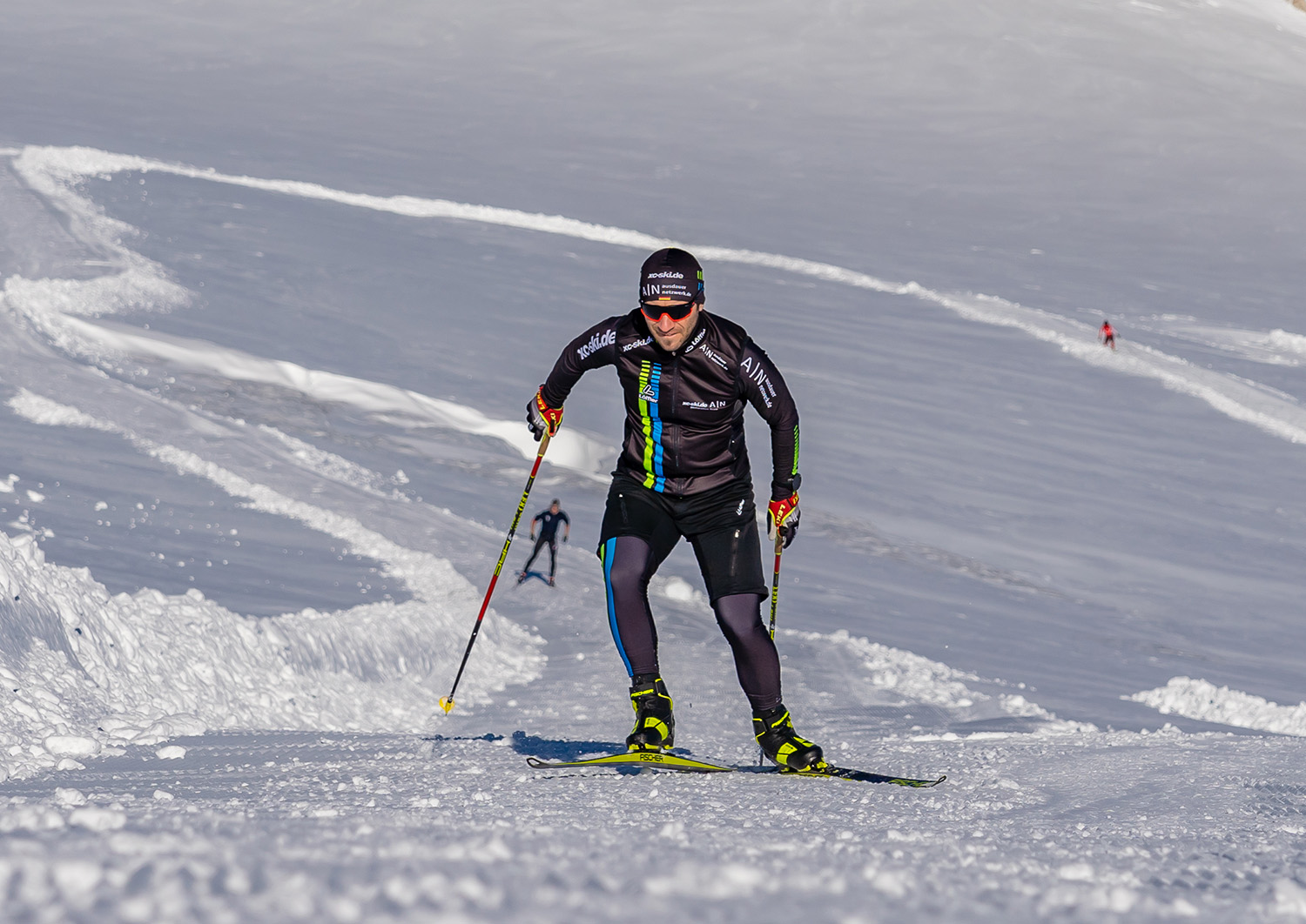Dank der weit zu öffnenden Schnürung und den beiden Laschen am Innenschuh gelingt der Einstieg in den Carbonlite Skate bequem und ohne größeren Kraftaufwand. Mithilfe des Schnellschnürsystems ist der Fuß schnell und sicher fixiert. Zugleich wird das Fersenband gestrafft, was den Sitz weiter optimiert. Die Schnalle des Vorjahresmodells vermisst man deshalb nicht. Beim Schließen des Reißverschlusses schmiegt sich die Außenhaut angenehm ans Bein. Die Schale lässt sich kinderleicht per Klettverschluss fixieren. Im Vergleich zum Speedmax macht sich ein etwas weicheres und höher geschnittenes Innenleben bemerkbar, das zudem für eine bessere Wärmedämmung sorgt. Nun aber ab auf die Loipe! Hier wird schnell klar, an welche Zielgruppe sich dieser Schuh richtet. Die Kraftübertragung ist sehr gut, der Stand auf dem Ski optimal. Das etwas bequemere Innenleben lässt ihn aber auch bei längeren Trainingseinheiten und Skimarathons nicht unangenehm auffallen. So kommt jeder auf seine Kosten, der beim Zieleinlauf nicht um Zehntelsekunden kämpft, aber dennoch der persönlichen Bestleistung hinterherjagt.