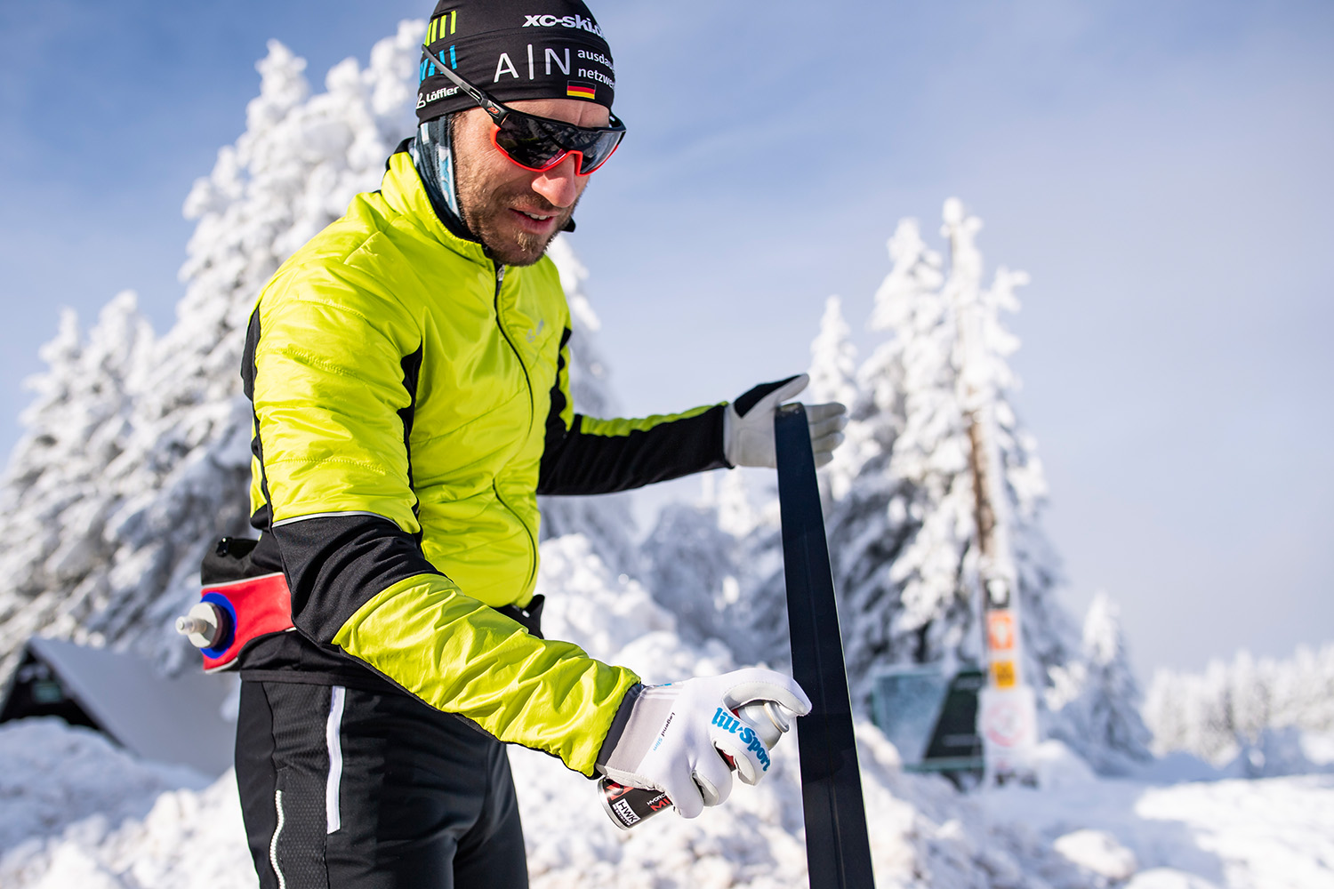 So schnell haben wir tatsächlich noch nie einen Ski gewachst! Fläschchen schütteln, aufmachen, Sprühknopf drücken und in einer schnellen Bewegung mit fünf bis zehn Zentimeter Abstand über den Belag bewegen. Fertig! Das Wachsen mit dem neuen Sprühsystem der HWK Hydro Wachse könnte leichter nicht sein. Nun muss der Belag allerdings noch bis zu 30 Minuten abtrocknen und im Anschluss könnt ihr das Wachs zur Optimierung noch mit einem Polierblock weiter einarbeiten. Im Grunde ist der Ski aber bereits nach dem Abtrocknen einsatzbereit. Als Zeitszenario würden wir empfehlen: Zuerst den Ski „einsprühen“ und erst danach für die Langlauftour umziehen. Bis ihr dann auf der Loipe steht, ist euer Ski trainingsbereit. Bis zu 15 Kilometer hält so eine Flüssigwachsbehandlung bei eher aggressiven Schneebedingungen. Bei umgewandeltem und nassem Schnee ist die Haltbarkeit länger. HWK-Chef und Wachsexperte Reini hat uns dazu noch einen Tipp gegeben. Den Trainingsski zunächst einmal gründlich mit Heißwachs einwachsen und für die folgenden Trainingseinheiten mit dem passenden Flüssigwachs „abdecken“. Ist das Flüssigwachs bei längeren Einheiten „verbraucht“, kommt das Paraffin zu tragen. Ihr müsst aber deutlich weniger oft zum Bügeleisen greifen. Der Spaß beim Training ist jedenfalls deutlich höher, wenn ihr immer mit dem passend gewachsten Ski unterwegs seid.