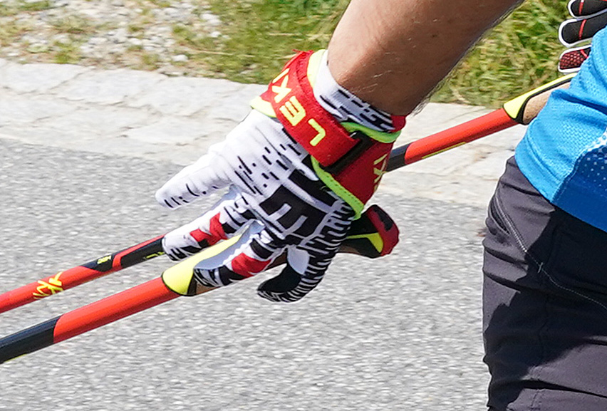 Das erste Hineinschlüpfen macht zwar etwas Mühe, aber das hat auch seinen Grund. Das Modell Sean kommt ohne Klettverschluss aus, was sehr zu begrüßen ist. Damit werden nämlich störende Druckstellen oder das Aufeinandertreffen von Handschuh-Klett und Stockschlaufe vermieden. Bereits beim zweiten oder dritten Mal Hineinschlüpfen passt die Öffnung dann perfekt. Größentechnisch fallen die Skiroller-Handschuhe normal aus. Die 8,5er sind mir etwas zu groß, 8er wie bei meinen Wintermodellen wären demnach optimal. Die Passform ist sehr gut und der Handschuh passt sich perfekt meinen Fingern an. Das dünne Obermaterial ist sehr luftdurchlässig, was sich vor allem in Aktion noch positiv bemerkbar machen sollte. Die Innenhand wird durch das weiche Kunstleder sehr angenehm bedeckt. Beim Greifen des Stockgriffs bilden sich keine Falten, die wiederum leicht zu Blasen führen könnten. Dank des dezent eingesetzten Silikondrucks hat man beim Greifen ausreichend Grip, bleibt aber beim Loslassen nicht am Griff „kleben“. Auch das verhindert Reibungspunkte und Blasenbildung. Bei Hitze und intensiver Belastung sorgt das mesh-artige Obermaterial für sehr guten Schweißtransport und Kühlung. Da vergisst man schnell, dass man überhaupt Handschuhe trägt. Die Touch-Einsätze an Daumen und Zeigefinger funktionieren gut, das Smartphone lässt sich also auch mit angezogenen Handschuhen bedienen.