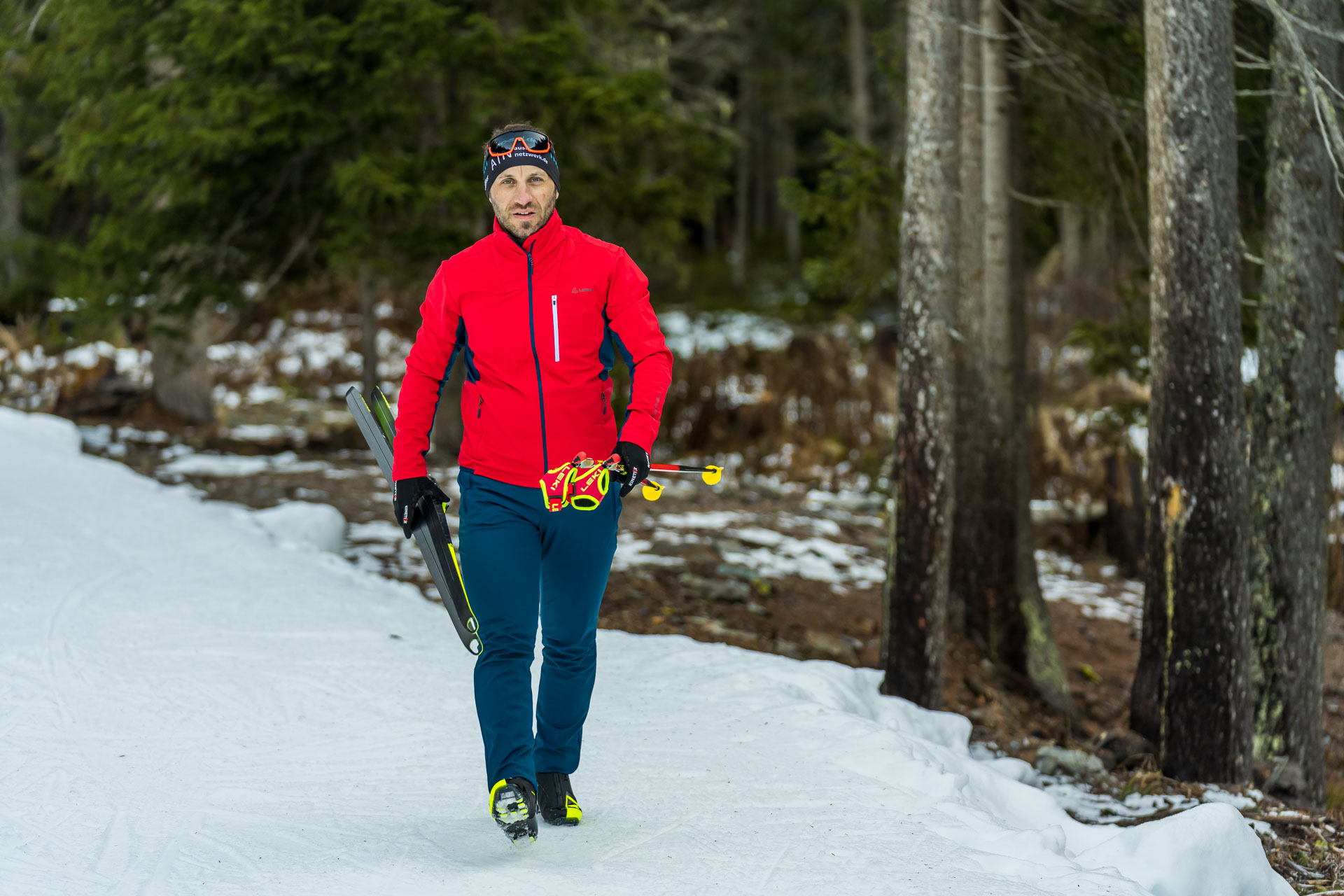 Schon beim Anziehen wird klar, bei Nordic TXS Jacke und Hose handelt es sich um zwei Teile ohne viel Schnickschnack. Die Funktion steht im Vordergrund, was ich als aktiver Sportler absolut begrüße. Das hat auch Auswirkungen auf das Gewicht, das, subjektiv empfunden, für eine Softshell sehr leicht ist. Und ein weiterer Aspekt fällt sofort auf: Das neue transtex Shell Material ist sehr flexibel und bietet nahezu optimale Bewegungsfreiheit. Das macht sich beim Langlaufen insbesondere bei schnellen Bewegungen bemerkbar. Die Arme lassen sich so ungehindert und ohne Widerstand nach hinten durchdrücken und auch den Beinen wird zum Beispiel im Anstieg eine große Schrittweite ermöglicht, ohne dass die Hose Widerstand leistet. Das ist angenehm und macht richtig Laune! Hauptfunktion der Oberbekleidung bleibt aber weiterhin der Wind- und Wetterschutz. Diese mit sehr guter Atmungsaktivität zu kombinieren war die große Herausforderung der letzten Jahre. Mit transtex Shell scheint die Lösung für dieses Problem gefunden. Das stellt das Material bei einer längeren intensiven Trainingseinheit über zwei Stunden bei null Grad Bedingungen unter Beweis. Eigentlich erwarte ich fast ein leichtes Frösteln, sobald ich richtig zu schwitzen beginne. Aber es bleibt aus. Zwar kühlt sich mein Körper durch den Schweiß etwas ab (was ja auch der Funktion des Schwitzens entspricht), aber ich friere weder bei schnellem Tempo in flachem Gelände noch in längeren Abfahrten. So trocken wie noch nie mit Außenschicht komme ich zurück am Startpunkt an und ich kann den Kleiderwechsel gemütlich angehen.