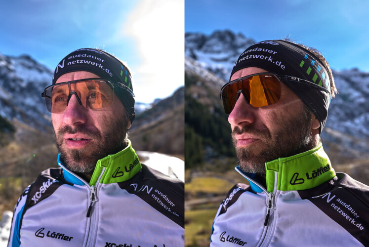 Beim Skilanglauf, wo Geländedetails entscheidend sind, empfehlen sich REACTIV 1-3 High Contrast-Gläser mit rosafarbener Basis. Diese Tönung verbessert Kontraste und verstärkt die Reliefdarstellung für präzisere Wahrnehmung.