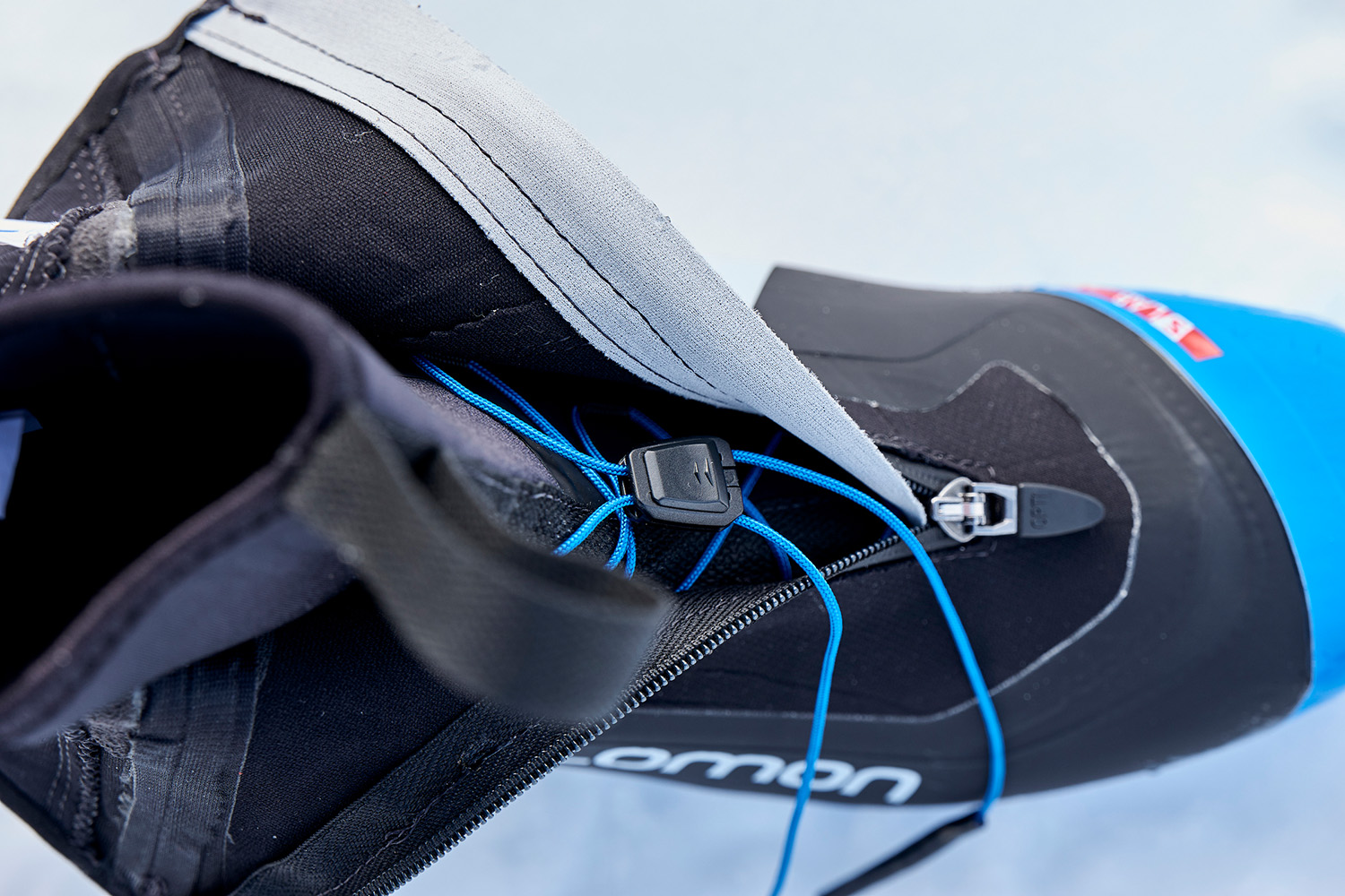 Mit dem S/Lab Carbon hatte Salomon vor wenigen Jahren den ersten „Voll-Carbon“ Schuh im Skilanglauf auf den Markt gebracht. Minimalistisch ausgestattet und komplett auf Gewicht getrimmt lag er in Sachen Preis deutlich über der Konkurrenz. Inzwischen hat man die Herstellungskosten deutlich reduziert und einige Modifikationen vorgenommen. Geblieben ist der Innenschuh, der hauteng den Fuß umschließt und hervorragenden Halt bietet. Die Carbon-Manschette ist in der neuen Verarbeitungsmethode „Carbon loaded“ entstanden, bei der Carbonfasern in eine Form gegossen werden. Die anatomische Form trägt insbesondere zur Seitenstabilität bei und erhöht die Präzision, mit der die Kraft aus dem Bein auf den Ski übertragen wird. Dass der Schuh in Zusammenarbeit mit den Salomon Weltcup-Athleten entwickelt wurde, versteht sich fast von selbst. Deshalb war natürlich auch das Gewicht ein entscheidender Produktionsfaktor. Trotz der großflächigeren blauen Gummierung des Vorfußes, die zum Schutz der darunter liegenden Carbon-Außensohle dient, liegt das Gewicht auf dem Niveau des Vorgängermodells. In Bezug auf Passform und Laufverhalten hat sich dagegen nichts geändert im Vergleich zu den Vorgängermodellen und das ist auch gut so. Wer also einen eng anliegenden, sehr stabilen und besonders leichten Schuh sucht, ist beim S/Lab Carbon genau richtig.