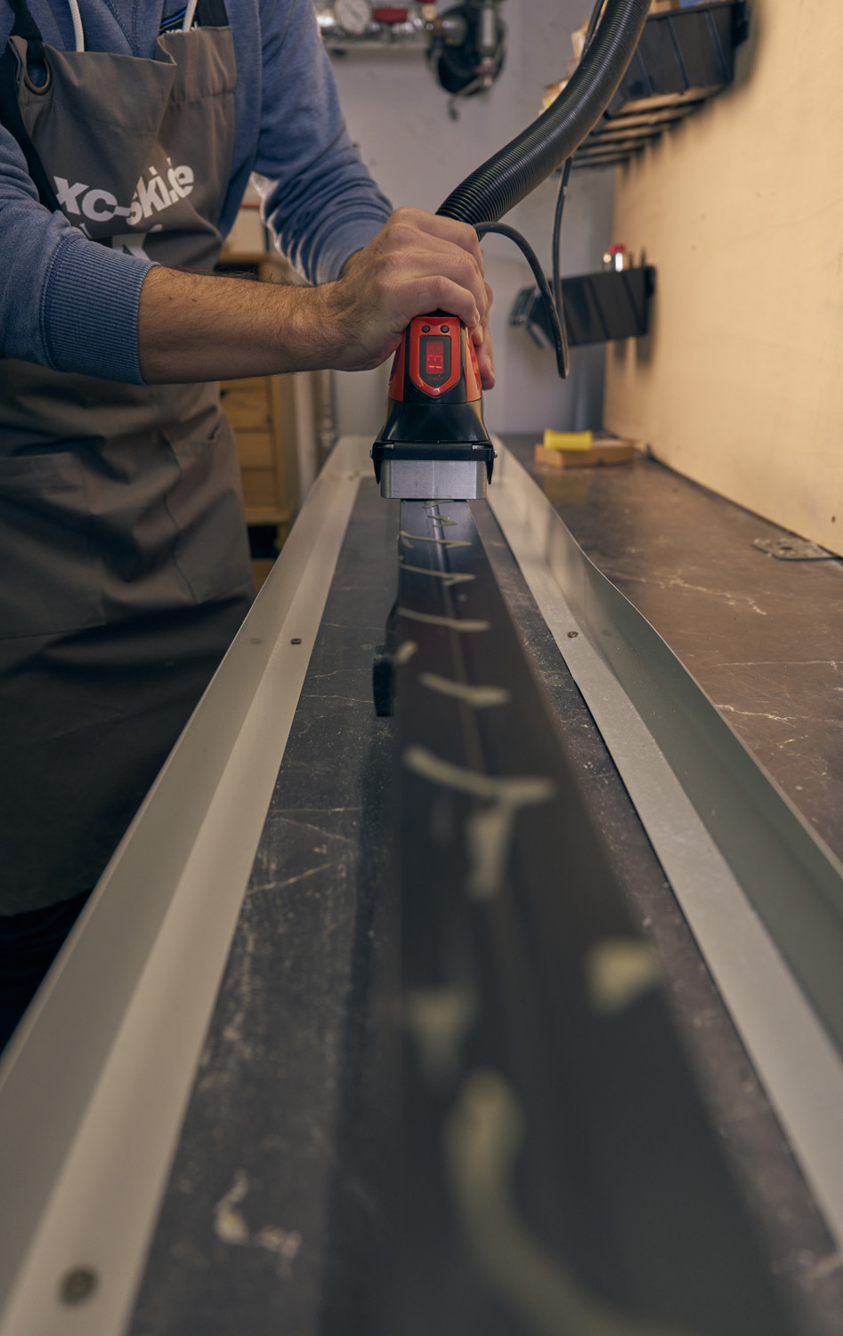 Sind alle Komponenten des Absaugsystems miteinander verbunden, kann es endlich losgehen. Das Swix World Cup T70 wird an den Strom angeschlossen und beginnt, die Bodenplatte aufzuheizen. Über die digitale Temperaturanzeige und zwei Knöpfe lässt sich die Temperatur ablesen und einstellen. Pro Knopfdruck geht es ein Grad nach oben oder unten. Sehr gut ist die Memory-Funktion des T70. So startet es beim Einstecken bei der Temperatur, bei der ausgesteckt wurde. Der Heizvorgang geht relativ zügig und bereits nach zwei bis drei Minuten ist die Soll-Temperatur erreicht. Das Wachs lässt sich an der Bodenplatte sehr gut erwärmen und auf den Belag tropfen. Dann beginnt das Einbügeln. Dabei gleitet das T70 mühelos über den Belag und hinterlässt eine gleichmäßige Fläche. So reicht eine einzige „Fahrt“ aus, um das Wachs überall zu verteilen. Beim Bügeln der Mittelrille muss man etwas aufpassen, da ansonsten der Absaugrahmen auf dem Belag aufsetzt. Die Absaugung an sich funktioniert sehr gut. Unser erstes Setup mit Rohrventilator konnte leider nicht überzeugen, aber nach dem Anschluss eines Nass-Trocken-Staubsaugers wurde der Wachsdampf perfekt abgesaugt.