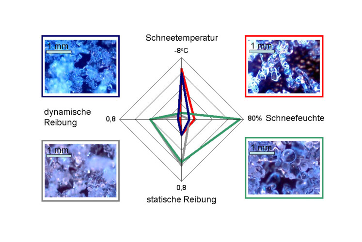 Das Bild demonstriert an vier repräsentativen Beispielen den Zusammenhang zwischen Schneetemperatur, Schneefeuchte, Gleit- und Haftreibung. Zusätzlich sieht man Mikroskopieaufnahmen des Schnees. Das Bild ist folgendermaßen zu lesen. In Teilbild blau beträgt die Schneekorngröße ca. 100 µm. Der Schnee ist kalt und die einzelnen Körner zeigen nur wenige gefrorene Verbindungen untereinander. Somit besteht die Gefahr, dass sich Körner in die Riefen der Schliffstruktur setzen und die Reibung erhöhen. In unserem Beispiel betrug die Riefenbreite der Schliffstruktur weniger als 50 µm, so dass diese Gefahr nicht bestand. Da die Körner abgerundet sind und sich kein freies Wasser zwischen ihnen befindet, gibt es keine Saugkräfte und die Reibung ist sehr klein. Im Teilbild rot herrschen ähnliche Temperaturen und Feuchten wie im Fall blau. Durch die größeren Körner wird der Einfluss der Schneefeuchte kompensiert, was sich in geringerer dynamischer Reibung äußert.
