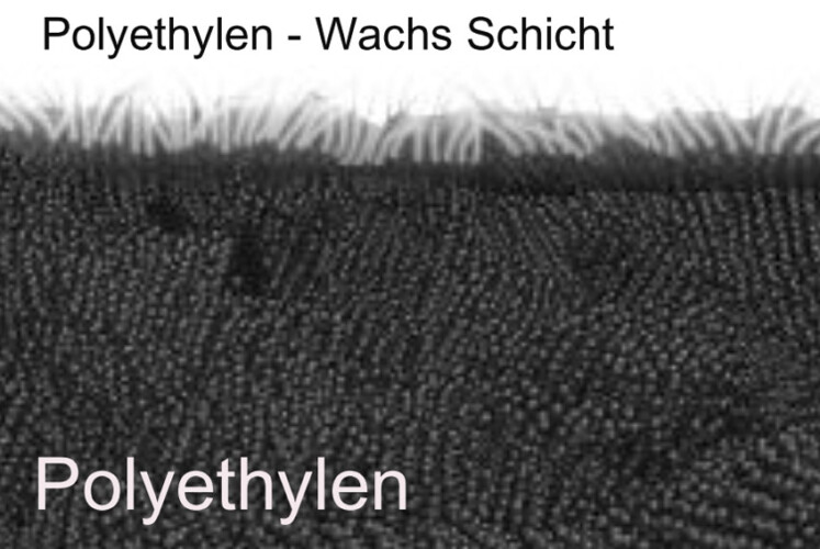 Im Skimagazin 4/2015 hatte ich die Gelegenheit, über den Skibelag als dem unbekannten Wesen zu schreiben. Ein Ergebnis langjähriger Fraunhoferforschung zu Skibelägen aus ultrahochmolekular-gewichtigem Polyethylen (UHMWPE) war die Entdeckung von molekularen Fusselstrukturen (ähnlich einem Flokatiteppich) auf der Oberfläche dieses Kunststoffs. Da UHMWPE keine Poren besitzt, stellt sich die Frage, was die Wachsaufnahme eines Skibelags möglich macht. Die Antwort findet man, indem man die Polymerfusseln näher, das heißt mit einem hochauflösenden Elektronenmikroskop, betrachtet. Während des Bügelns wird Wachs Teil der Fusselstruktur, wie es im Titelbild schematisch gezeigt ist.