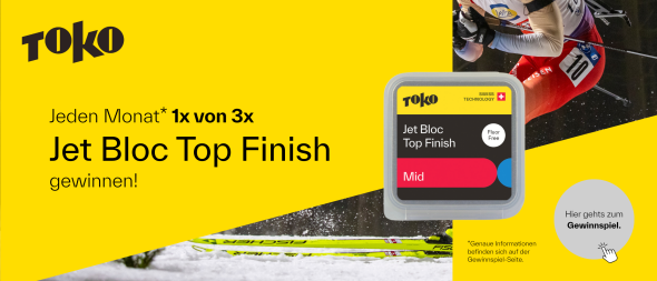 Jetzt ist er da - der neue Jet Bloc Top Finish! Für all diejenigen, für die jede Hundertstelsekunde zählt. Der Rub-On Block der Weltcup-Profis, entwickelt für maximalen Speed und Beschleunigung, ergänzt die bestehende Top Finish Serie der Schweizer Traditionsmarke Toko und sorgt nicht nur bei den Profis für neue Top-Resultate. Gewinne jetzt monatlich 1 von 3 Jet Bloc Top Finish-Blöcken. Einfach mitmachen & mit etwas Glück durchstarten!