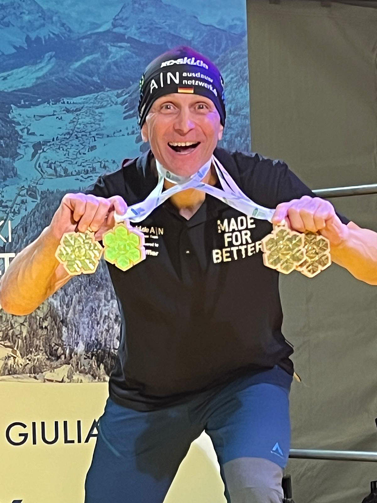 Es folgten noch ein paar Tage entspanntes Höhentraining auf der Seiser Alm, um dann nach Sappada umzusetzen, einem kleinen deutschsprachigen Ort (Plodn) in den Karnischen Alpen im Nordosten Italiens. Bereits am nächsten Tag stand der erste Wettkampf über 20 km in der klassischen Technik an. Nach leichten Plusgraden am Vortag waren früh minus 8°C zu verzeichnen. In meiner Altersklasse waren gute Klassikläufer am Start und ich der einzige „Schieber“, also ohne Steigwachs auf dem Ski. Bei den vier Runden a 5km war je Runde eine Klassikzone dabei, in der filmend kontrolliert wurde, also hieß es, den klassischen Stil zu imitieren und die dabei entstehenden ca. 20m Rückstand wieder aufzuholen. So ging es vier Runden lang, Lücke da, schieben unter Volllast, Lücke geschlossen, ein wenig erholen, um in der letzten Runde in der letzten Spitzkehre die entscheidende Attacke zu setzen. Es gelingt, ich bin vorn, die drei anderen direkt dahinter, der Puls rast, die Luft wird immer knapper. Trotzdem erhöhe ich im Zielgarten nochmal die Frequenz: Sieg, völlig fertig, nach Luft schnappend, kaum zu realisieren, meine erste Goldmedaille bei einem Masters World Cup! Wahnsinn!