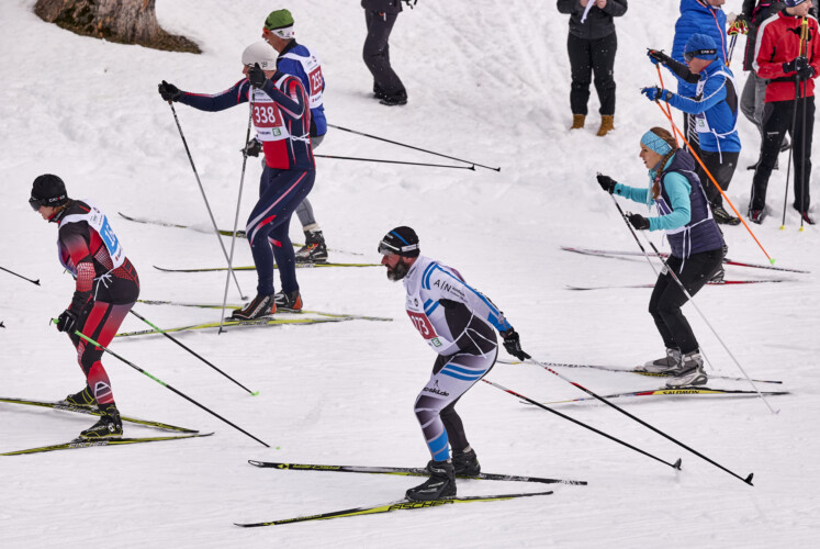 Ich quälte mich weiter Richtung Vorberg und Kulm. Die Sonne schmolz das Eis und der Schnee wurde „Batzig“ wie wir dahoam sagen. Es saugte mich in den steirischen Schnee. Während ich so langsam dahin gleite kommen immer wieder Zurufe vom Publikum. „Heh du schaust aber nu guat aus, bist nu schee stabil“. Ich wusste nicht, was ich davon halten sollte. Waren es Kundgebungen von Ungläubigen oder von Tourismus Managern die mich auch später in der Ramsau als Gast wieder sehen wollten. Die letzten Kilometer zogen sich wie ein Strudelteig aber der Schweiß war nicht süß. Zum Abschluss durfte nochmal der Ramsauer Hausberg, der Kulm bezwungen werden. Wenn wir schon mal hier sind, hat sich der Streckenchef wohl gedacht. Noch vier Kilometer. Nur noch bergab. Ein paar scharfe Kurven. Noch 2 Kilometer. Sie nützen wirklich jeden Meter Almwiese aus. Nochmal eine scharfe Steilkurve rauf und runter. Jetzt wird’s es wohl gewesen sein mit den Überraschungen. Falsch. Noch 500m bergab, die Geschwindigkeit steigt und ich sehe die Loipe nicht mehr. Die Augen schmerzen vom Wind und der Schatten macht alles dunkel, ich erkenne nix mehr. Plötzlich ist hier eine 180 Grad Kurve, die nicht gekennzeichnet ist. Gar nicht! Ich kratze die (Eis) Kurve aber stilsicher und hopp über die Ziel Brücke und Schwupps ich bin im Ziel.