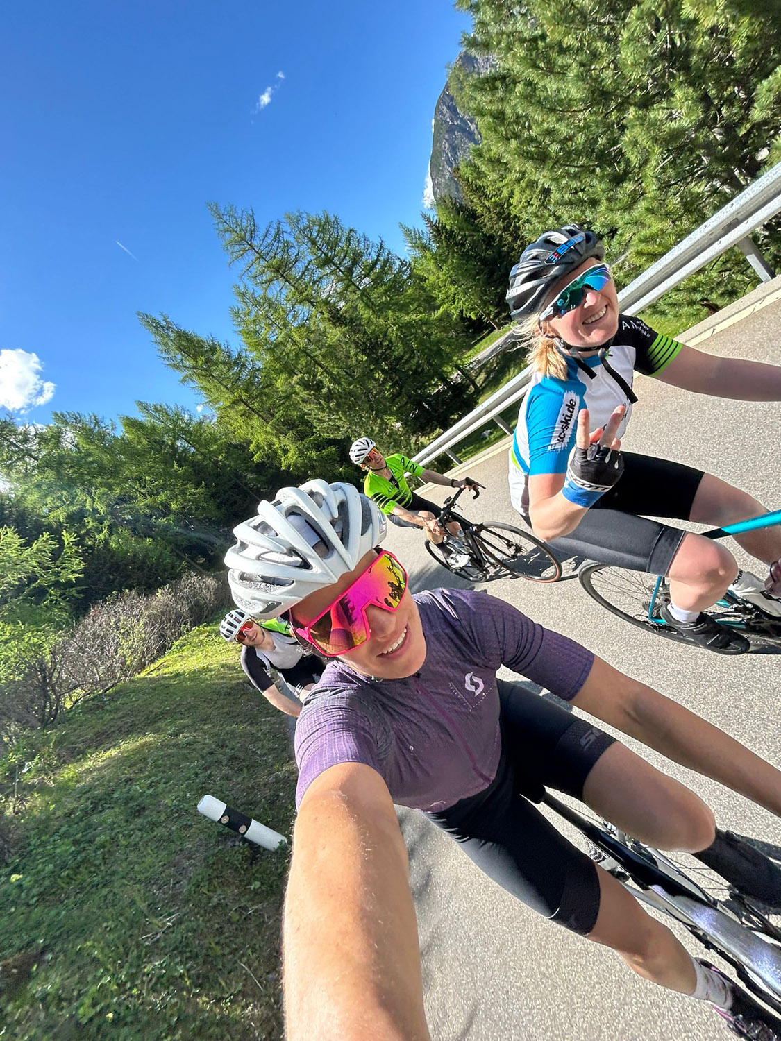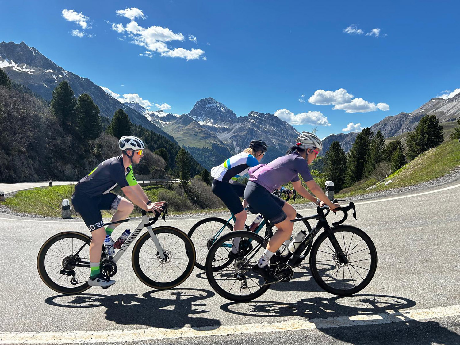 Auf diesem Radweg startete auch Tag drei, der ganz im Zeichen des Albula-Passes stand. Nach einer kurzen Warmlaufrunde wurden die insgesamt neun Kilometer und 628 Höhenmeter mit Skirollern in Angriff genommen. Je höher das Leistungsniveau, desto länger wurde das Einlaufen konzipiert, um möglichst wenig Wartezeit am Pass zu erzeugen. Und so kämpften sich alle Camp-Teilnehmer den sechs Kilometer langen Steilabschnitt und die folgenden drei deutlich flacheren Kilometer bei angenehmen Temperaturen und Sonnenschein hinauf. Im Ziel wurde jeder Finisher gebührend gefeiert. Nach einer kurzen Mittagspause im Hotel ging es dann mit dem Rad erneut in Richtung Albula Pass. So manch einer trat an, um seine Zeit vom Vormittag zu unterbieten und die Ausdauerndsten unter den Teilnehmern fuhren sogar bis Preda hinab, um auch die andere Seite des Passes unter die Reifen zu nehmen.